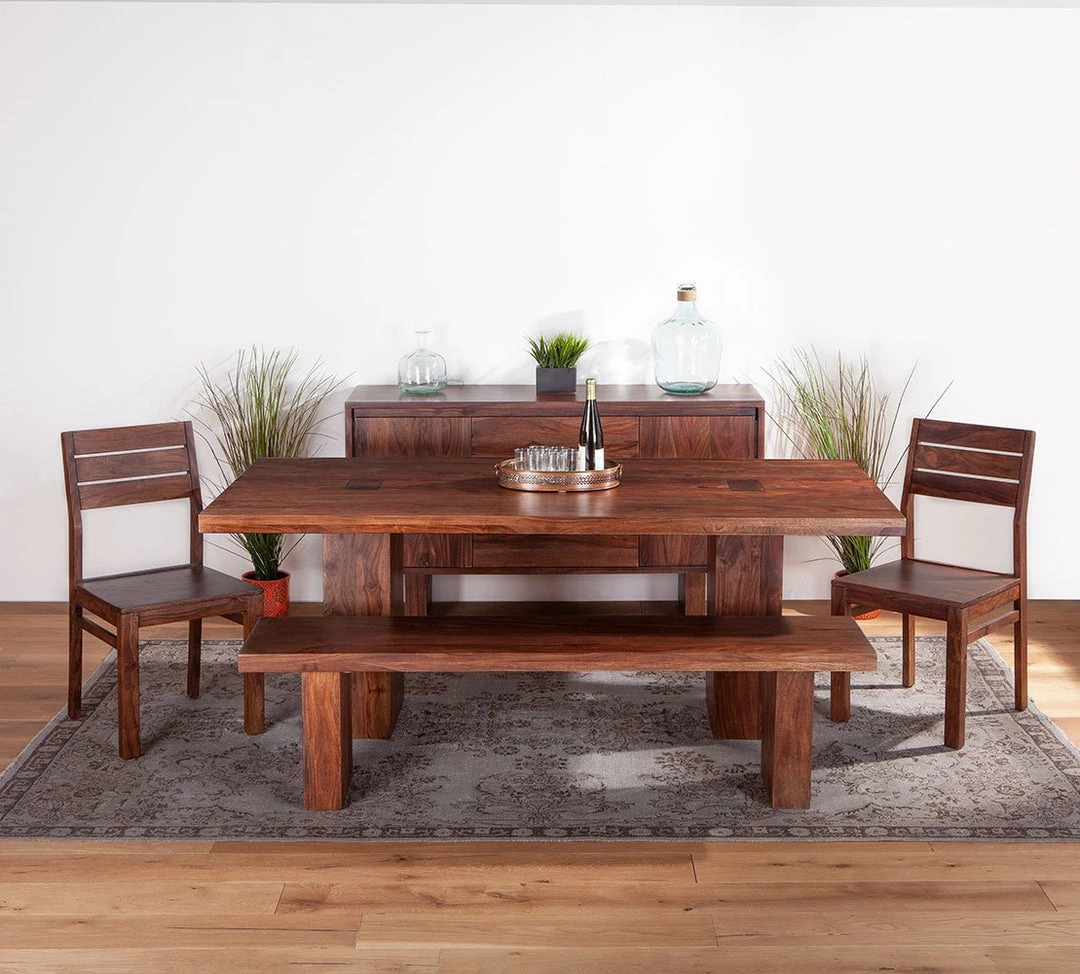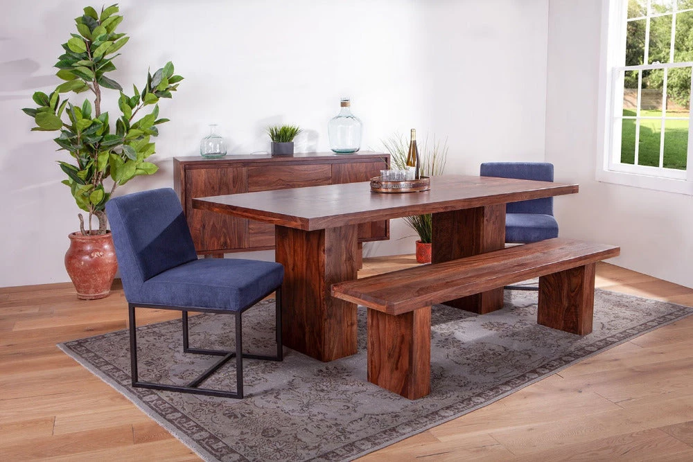 Featuring a floating top seat and matching legs, this simple modern design lends itself to any casual dining experience without compromising style. Our water-based, catalyzed walnut finish displays the natural grain and coloration of our sustainably-sourced sheesham wood.