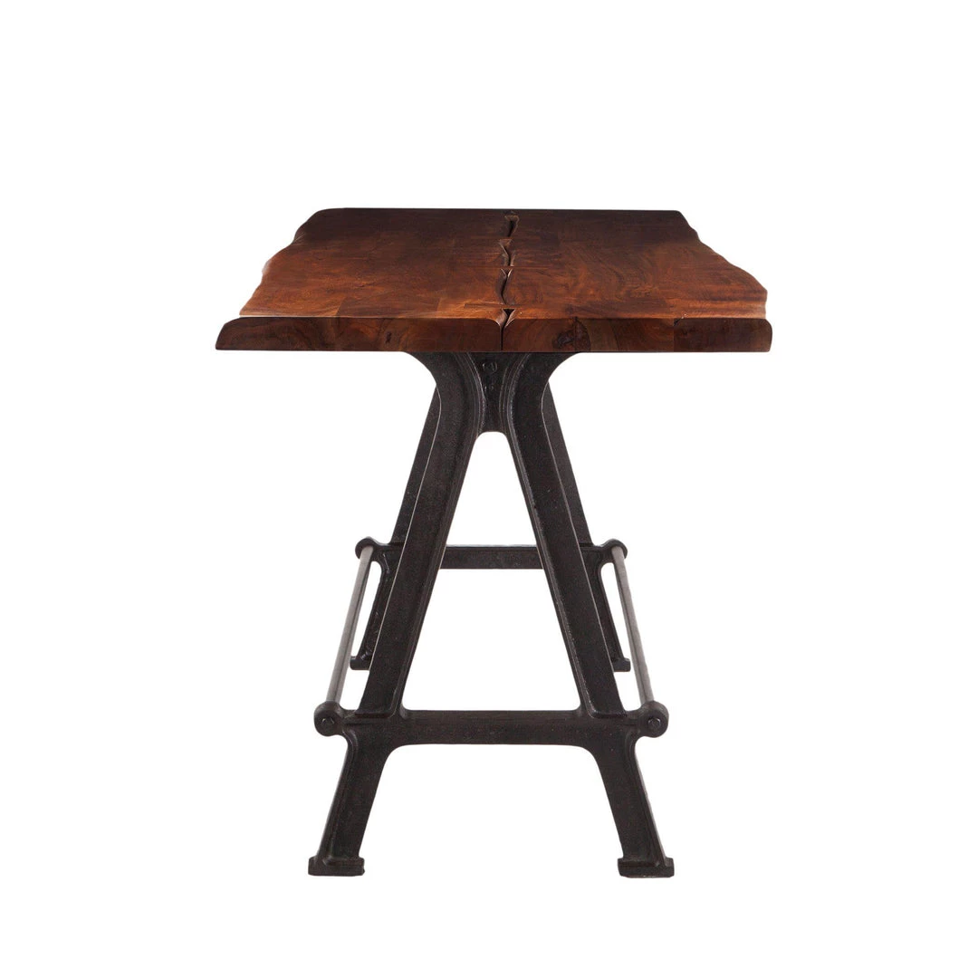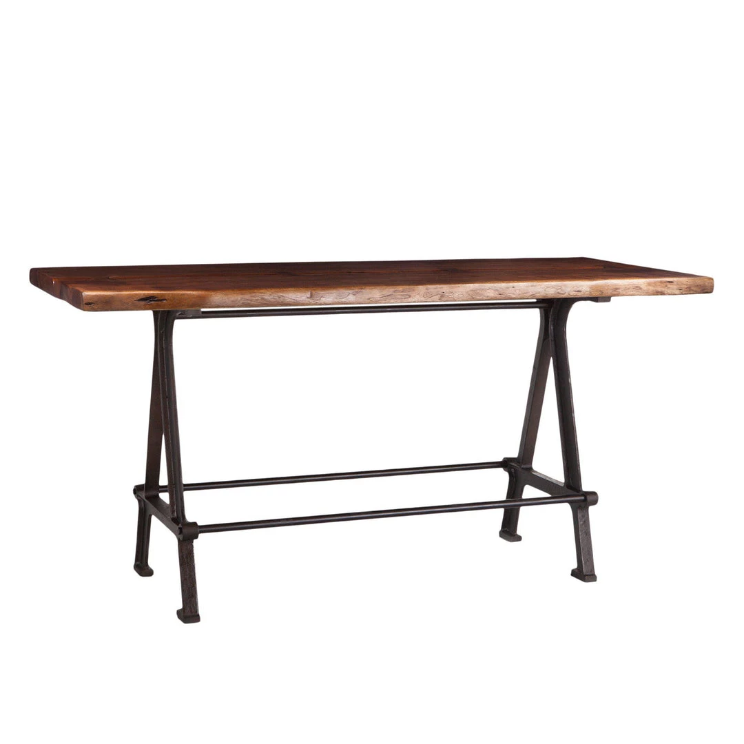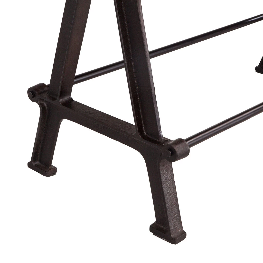 Affixed to the base of the tabletop is a trestle-style iron base in antique zinc finish which includes a footrest 10 inches from the floor affording your guests a perfect place to rest their feet when seated. The sleek iron base creates a beautiful fusion of natural and industrial elements with the glossy, live edge tabletop. This table requires some light assembly.