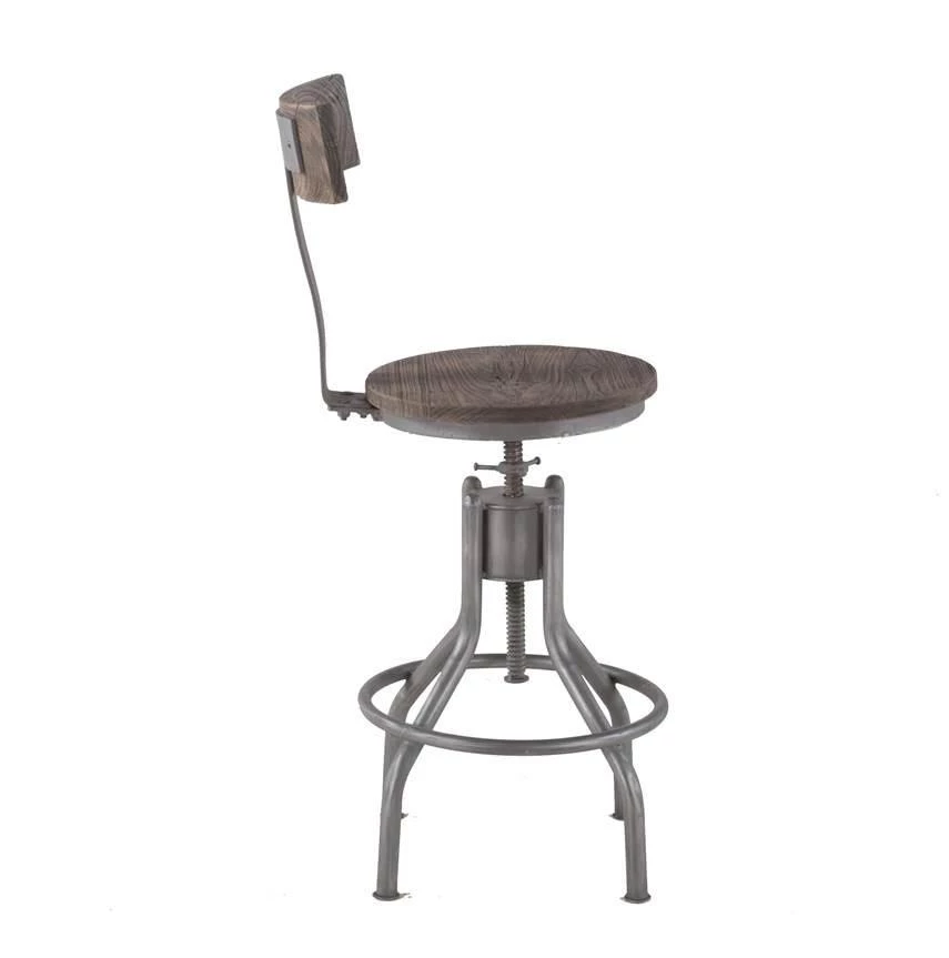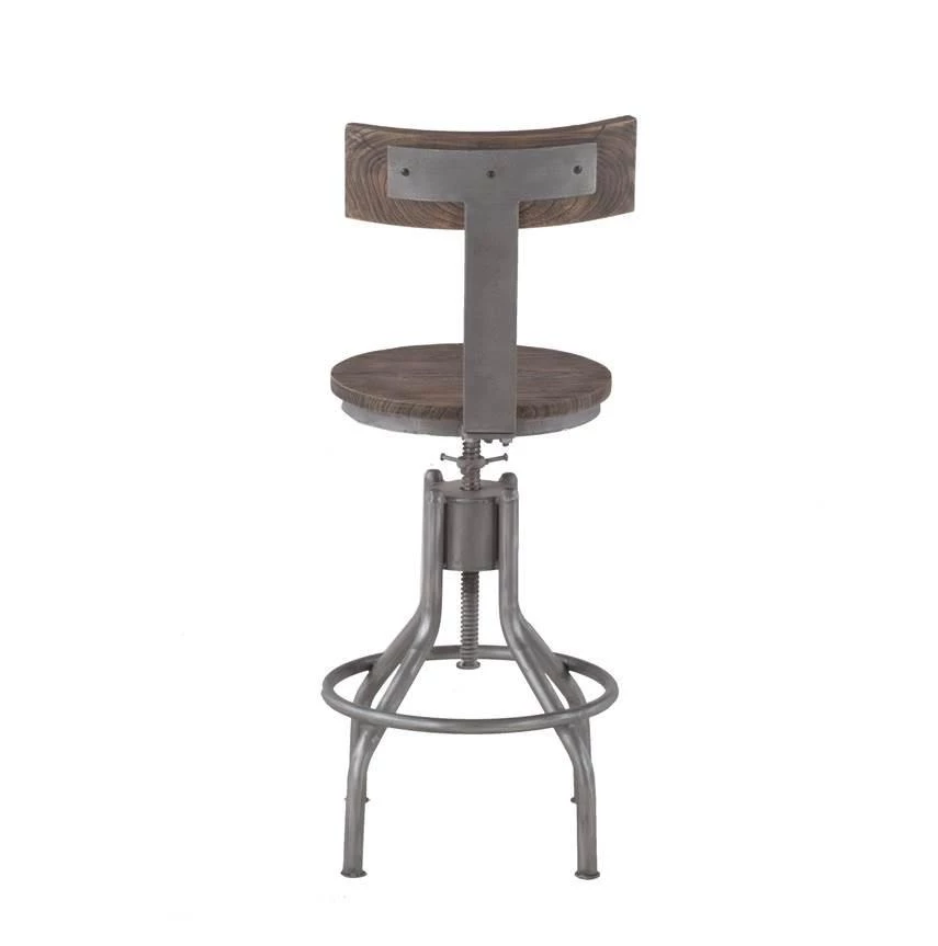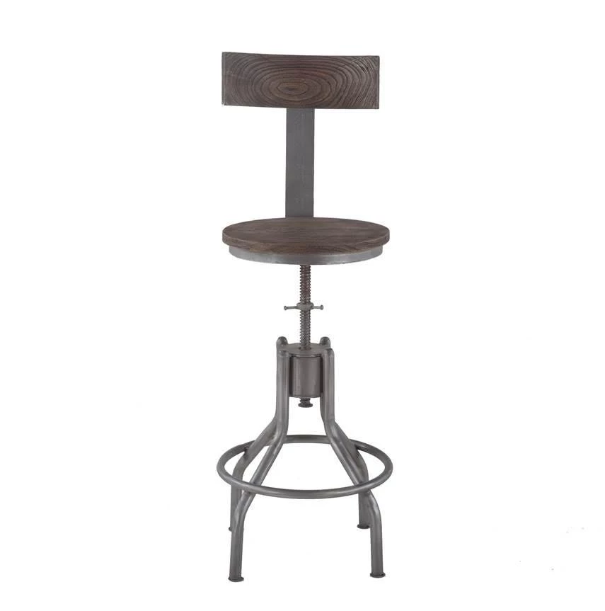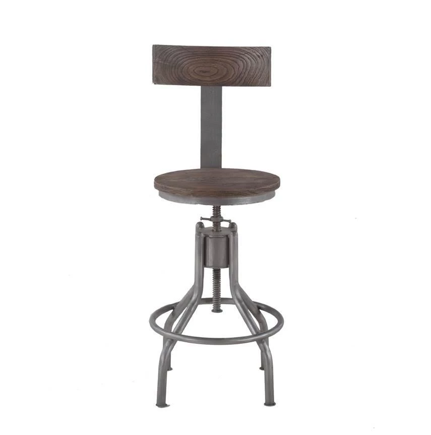 This adjustable bar stool features a round seat and curved seat back, both made of recycled teak in a weathered gray finish. The seat features a swivel mechanism and is framed in a reclaimed cast iron base with an antique styled footrest. The industrial swivel mechanism adjusts the chair height from 35 to 44 inches. This pre-assembled Artezia bar stool is ready-to-use and of the finest quality, and with its industrial feel, it will make an effortless addition to any home.