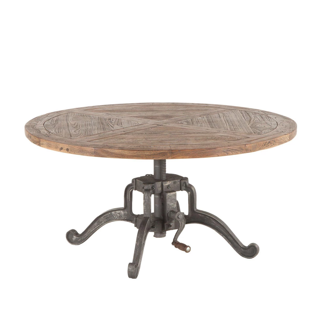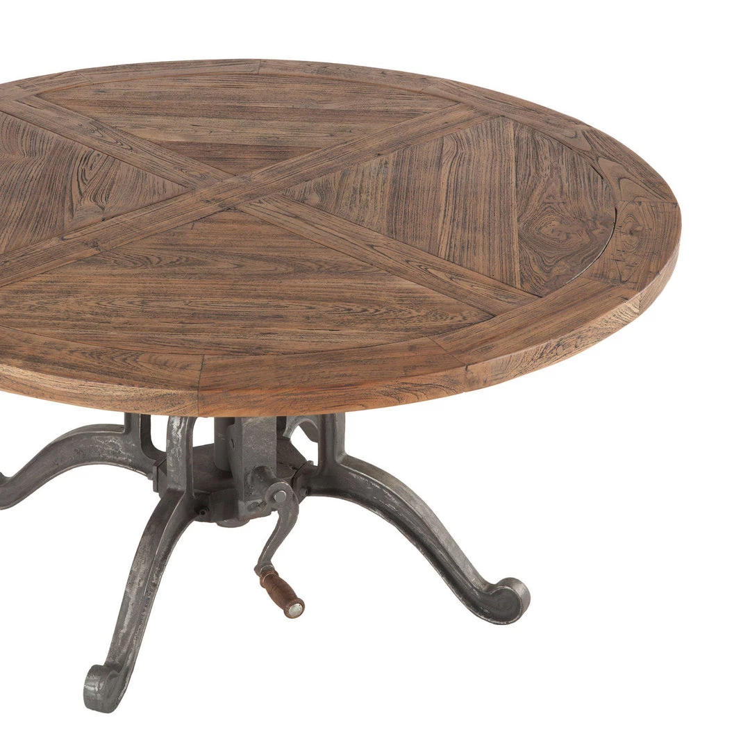 This hand-crafted round coffee table has a reclaimed teak wood table top with a water-based, catalyzed, Spanish Gray finish offering durability while showcasing the natural grain of the wood. Affixed to the base of the table top is a rod that fits into the iron base where the industrial crank mechanism is connected to an antique styled handle, allowing the table to be adjusted both up and down to whatever height works best for your needs.
