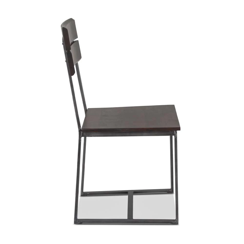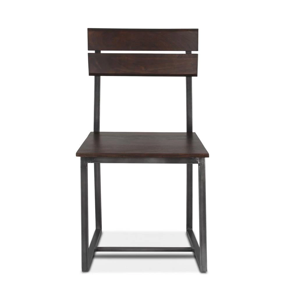 This handcrafted dining chair has an acacia wood seat and seat back with a dark brown Jacobian finish that offers durability while showcasing the natural grain and beauty of the wood. The chair’s seat rests at the standard dining height and has clean squared edges of the seat lending to its modern style. The seat includes two iron U-shaped sled legs featuring a gray rubbed finish, creating a fusion of natural and industrial elements. This dining chair is pre-assembled and is made with materials of the finest quality, making it an effortless addition to any home.