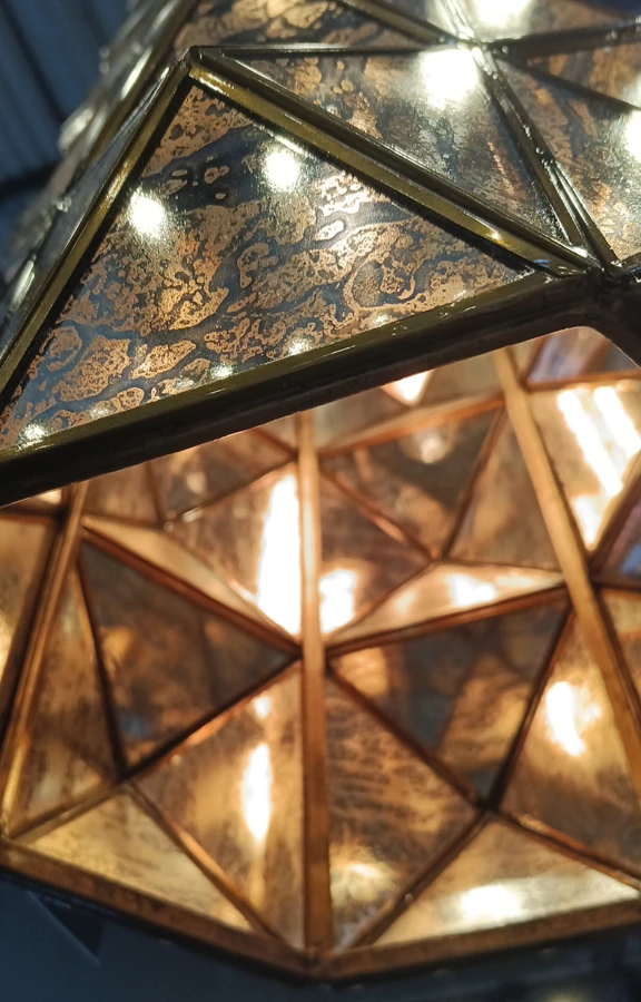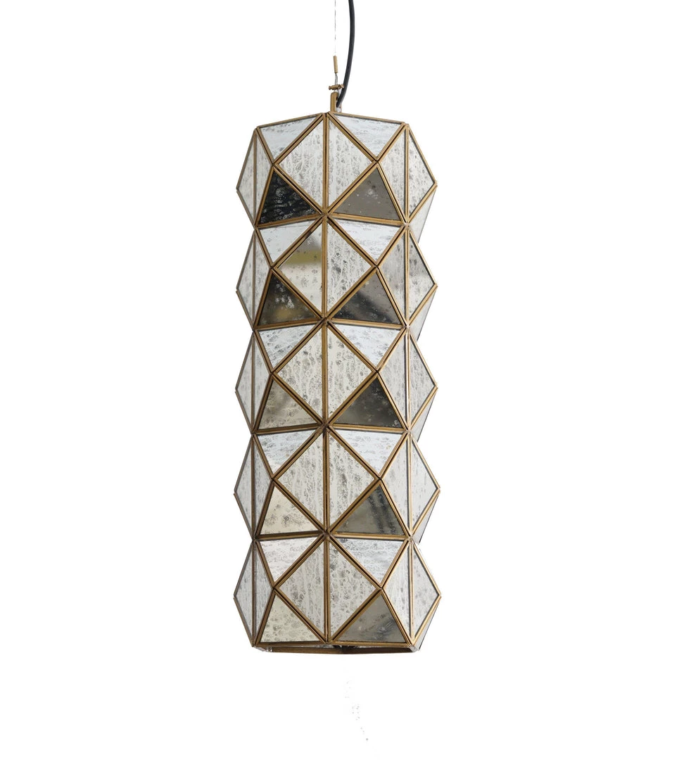 - Pendant features a lamp shade of metallic silver glass panes that extend out on the sides for a prism effect