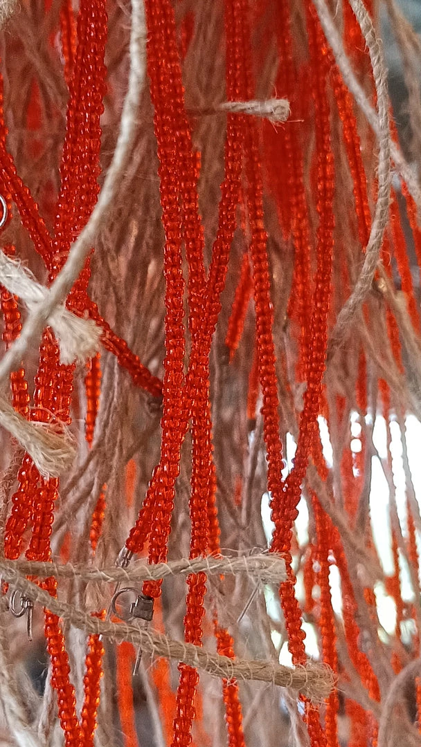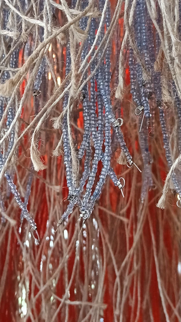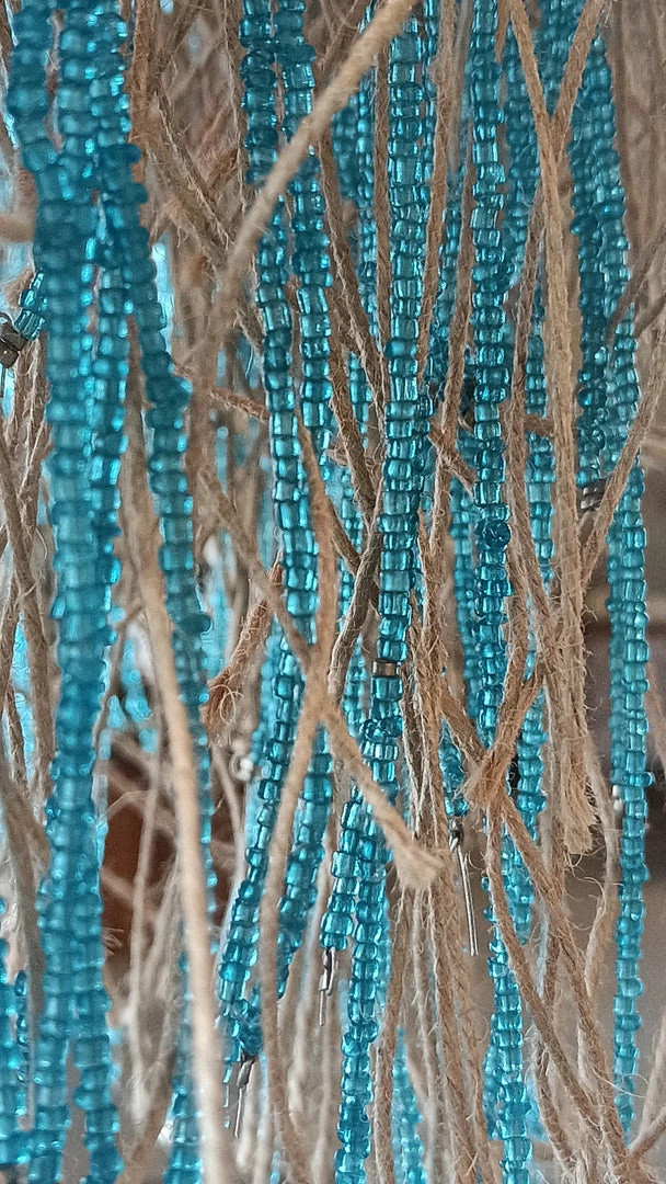 - Weaved in with the jute are threads of various colors (blue, natural, orange, or silver) glass beads