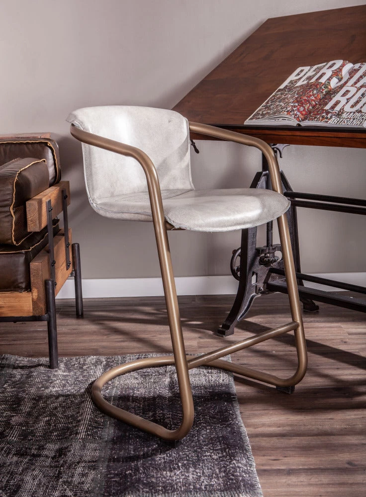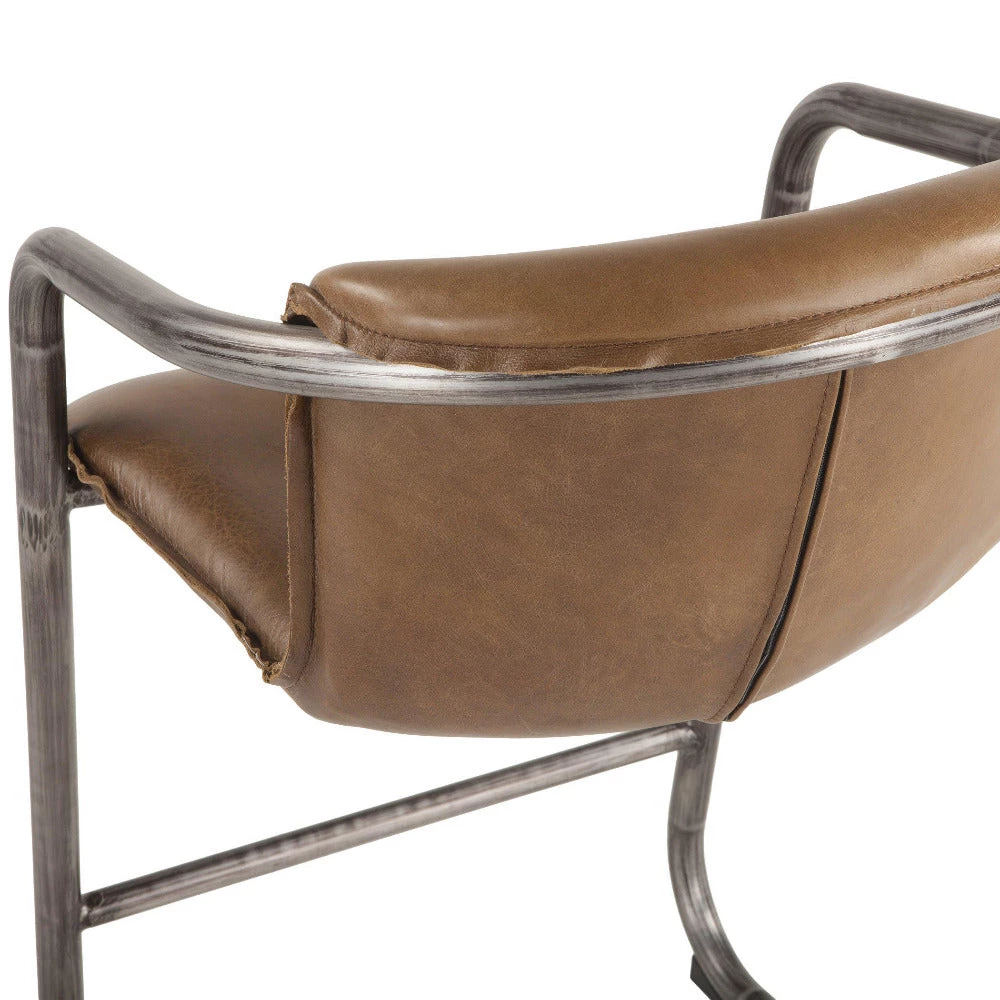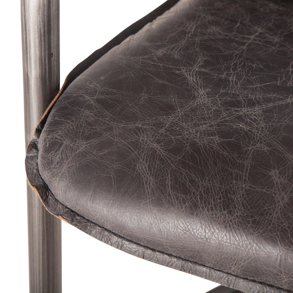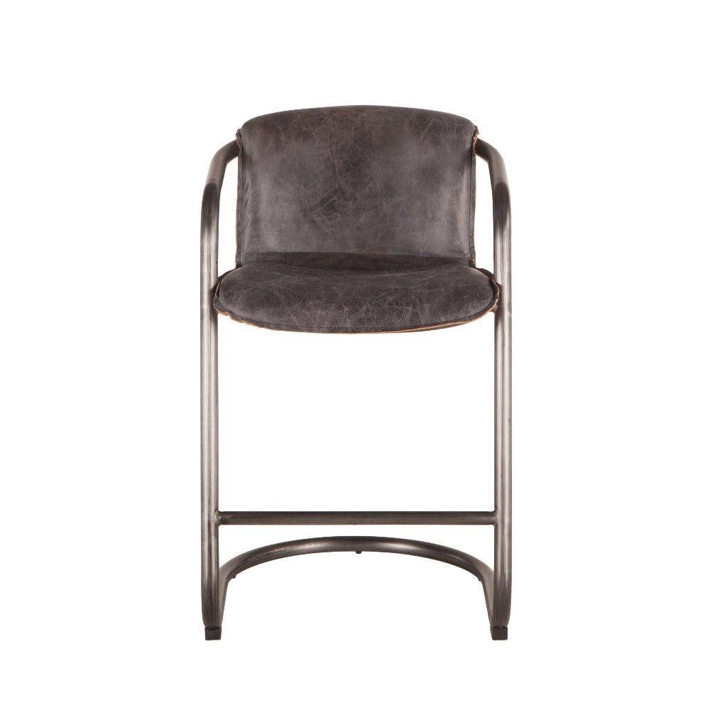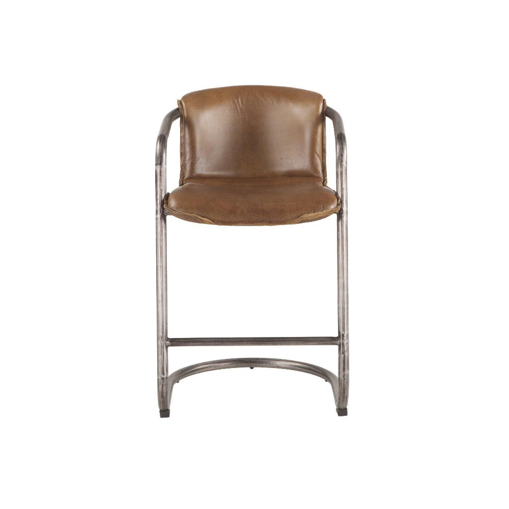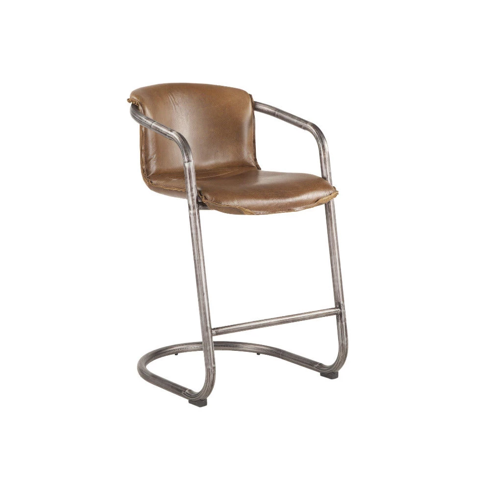The distressed leather seat has a soft feel for ultimate comfort, while the exposed trim provides vintage flair. The U-shaped steel frame and legs in rustic, brushed finish include levelers with caps to protect all types of flooring. Combine with your favorite counter-height gathering table for a casual dining space or add a few to your island or counter space for the perfect work area. This pre-assembled counter chair is ready-to-use.