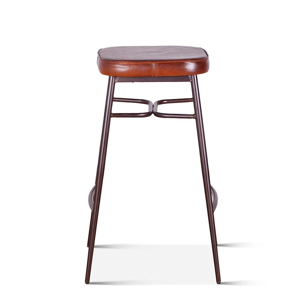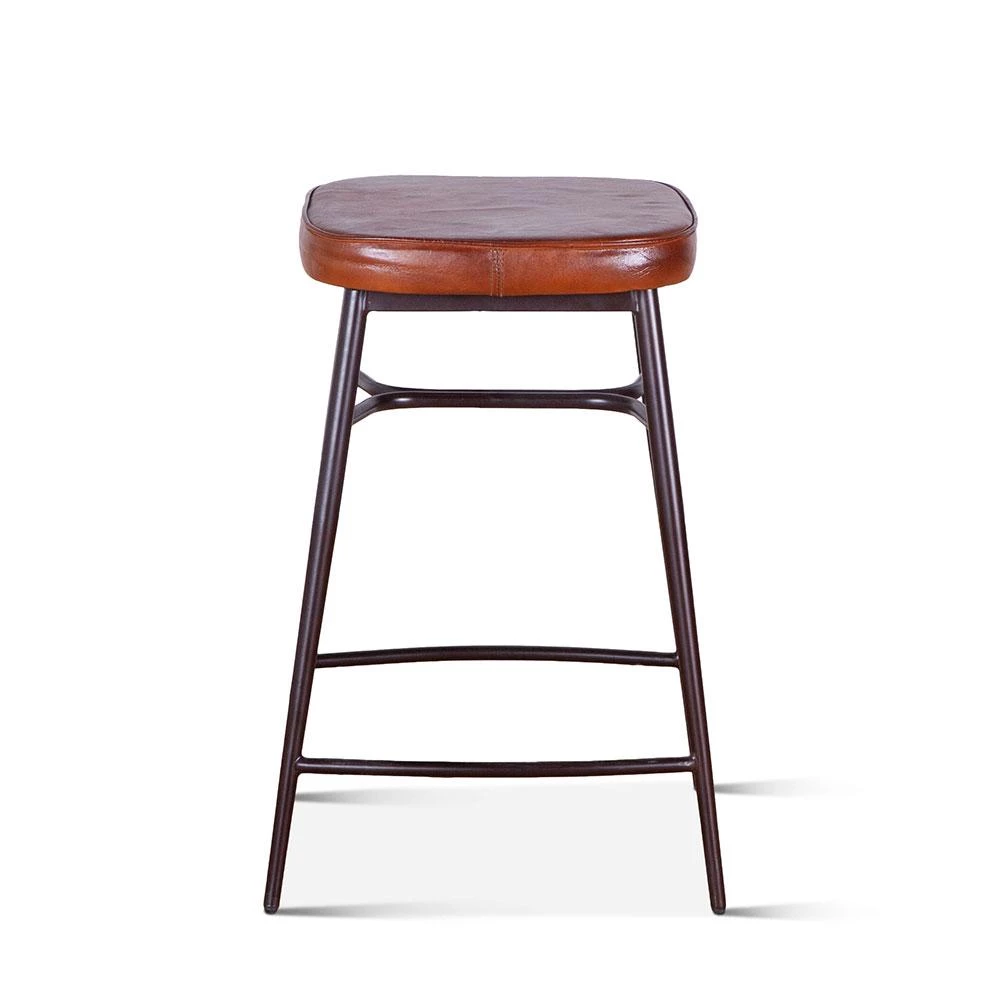 The rich goat leather of this stool is molded for ultimate comfort, while the stitched detailing accentuates the retro look of the seat. The iron frame and legs have a powder coated brown finish, and levelers with caps adorn the feet to protect all types of flooring. Pair with your favorite bar or countertop for a casual gathering spot, or add to an industrial desk for a stylish work space. The stool is pre-assembled.