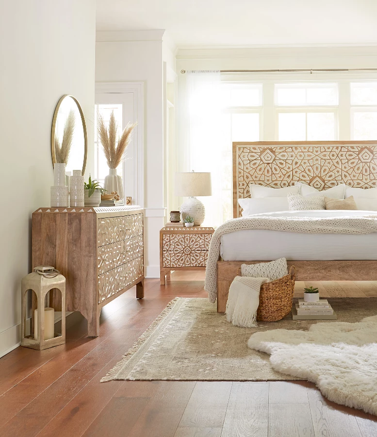 Inspired by India culture and architecture, this collection showcases hand turned legs and remarkable floral and geometric pattern detailing hand-carved in the wood by our highly skilled artisans, creating a stunningly dramatic statement. This beautiful dresser features a natural white patina that enhances the carvings and complements a variety of styles, while also offering durability for daily use.