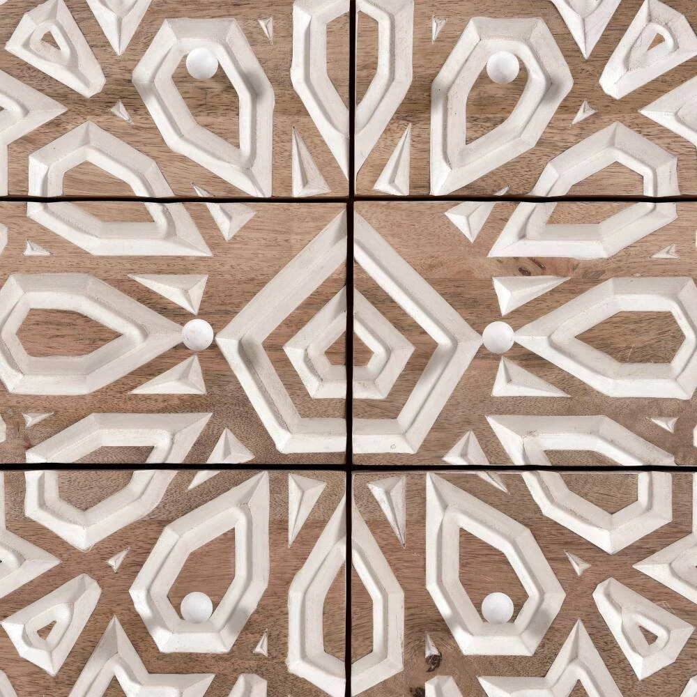 With six drawers, each with a small white knob handle, this horizontal dresser provides enough room to house all your favorite clothes. The dresser rests atop squared mango wood legs, further emphasizing the attention to detail in the carved designs. No assembly required.