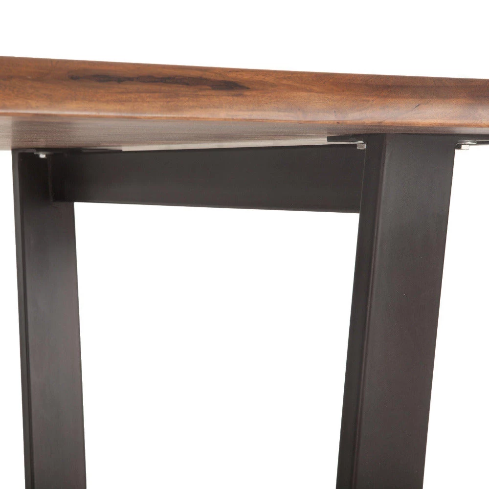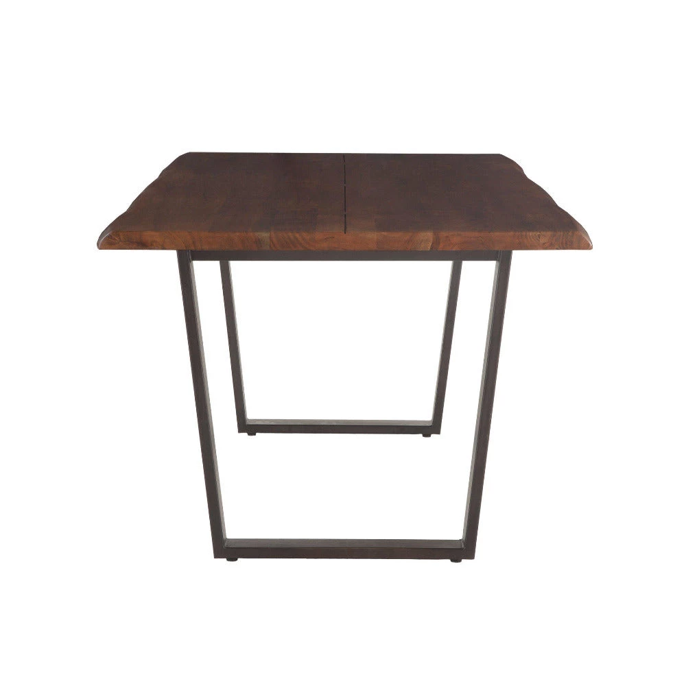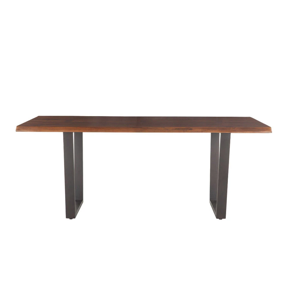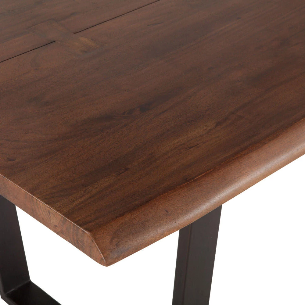 Combining organic silhouettes with modern details for a casual and transitional style, this handcrafted faux live-edge dining table is cut from a thick acacia wood slab featuring uneven edges and butterfly joinery detailing. The catalyzed water-based dark walnut finish on the wood creates an amazing luminosity that evokes beauty from every angle while also being durable for daily use. The Blayne tabletop rests atop two reclaimed iron U-shaped legs in antique zinc finish, creating a fusion of natural and industrial elements. This table requires assembly.