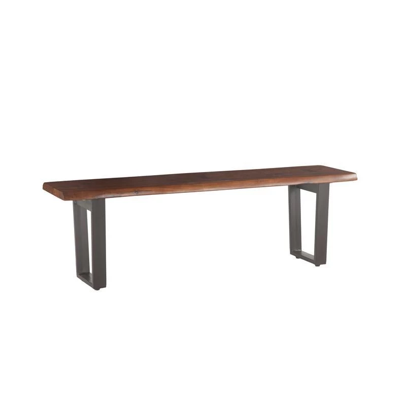 Combining organic silhouettes with modern details for a casual and transitional style, this handcrafted faux live-edge dining table is cut from a thick acacia wood slab featuring uneven edges and butterfly joinery detailing. The catalyzed water-based dark walnut finish on the wood creates an amazing luminosity that evokes beauty from every angle while also being durable for daily use. The bench’s seat rests atop two reclaimed iron U-shaped legs in antique zinc finish, creating a fusion of natural and industrial elements. This bench requires some light assembly.