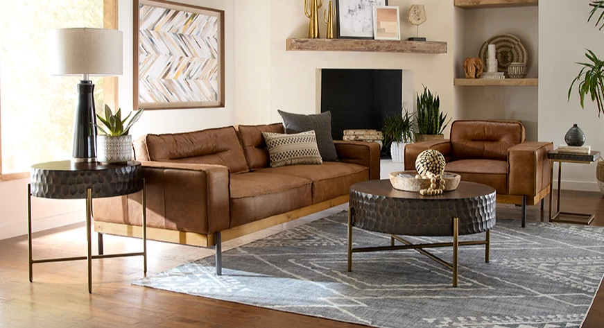 - Sofa is upholstered in distressed, top-grain cognac leather