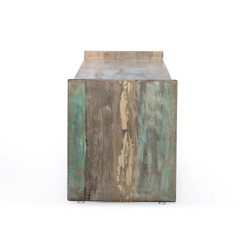 An airy pastel finish exudes a casual, coastal charm in the pieces of the Cordoba collection. This handcrafted solid wood dining bench is fashioned from reclaimed wood with a hand-applied teal patina finish on the wood that offers durability while showcasing the natural grain of the wood.