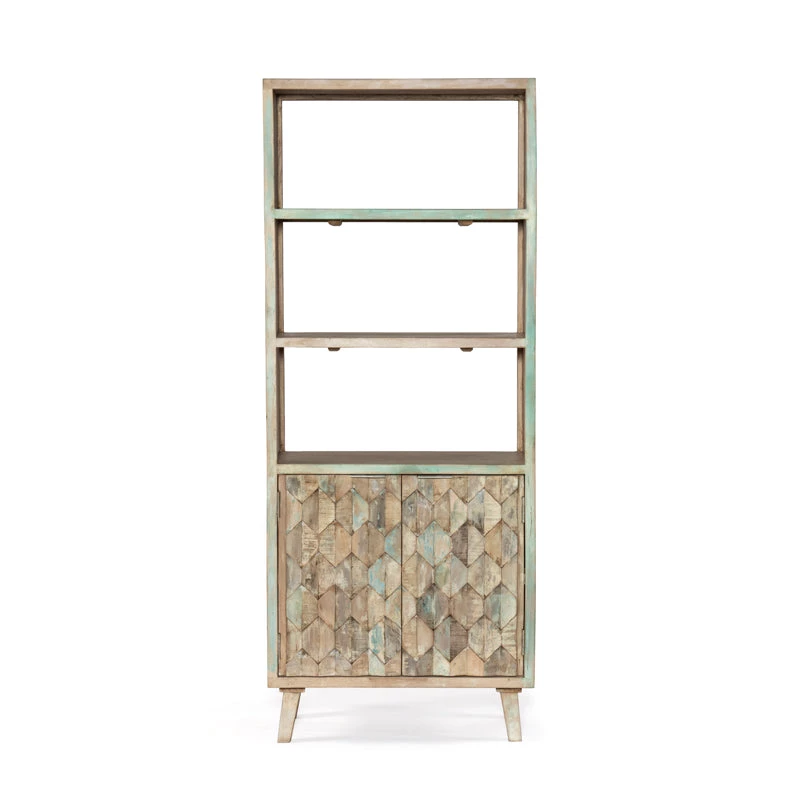 An airy pastel finish exudes a casual, coastal charm in the pieces of the Cordoba collection. This handcrafted solid wood bookcase is fashioned from reclaimed wood with a hand-applied patina finish on the wood that offers durability while showcasing the natural grain of the wood. Across the cabinet doors is a unique, geometric design of hexagon-shaped pieces of reclaimed wood that fit together in a simple yet intricate pattern.