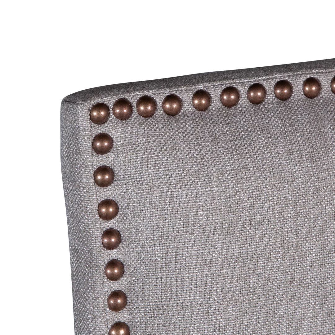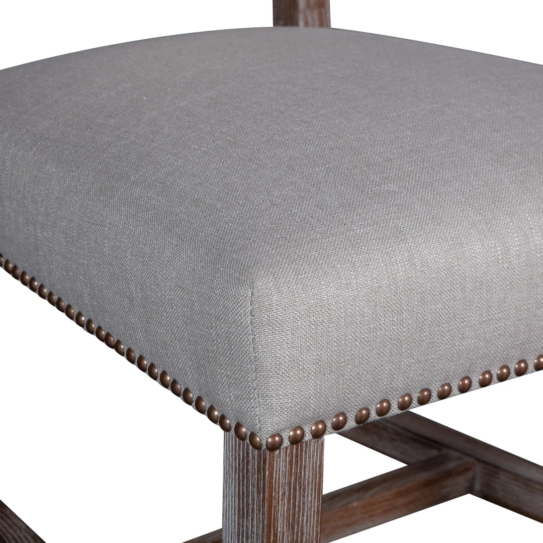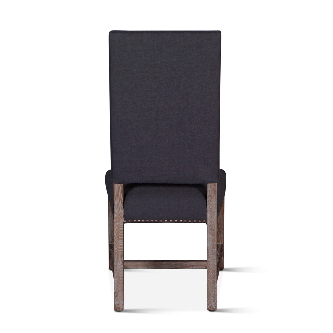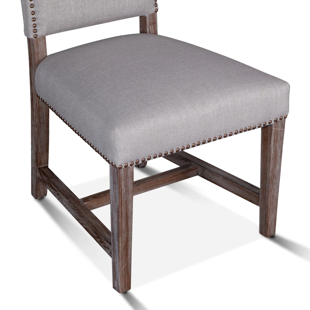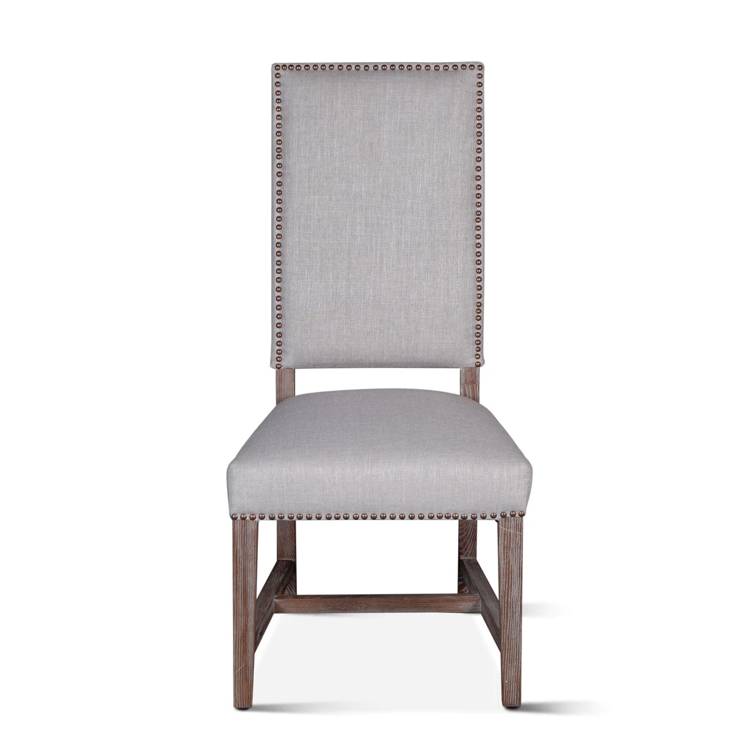 The Dani chair brings sophistication to any setting. The high back formal parsons style design works well with larger dining tables or as a captain’s chair. The frame and base of this chair are constructed from solid oak and feature a gently distressed gray wash finish. The chair is upholstered with a natural linen lined with bronze studs. This chair pairs well with our Pengrove, Chatham Downs, or Hampton Beach collections.