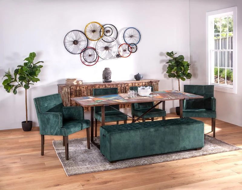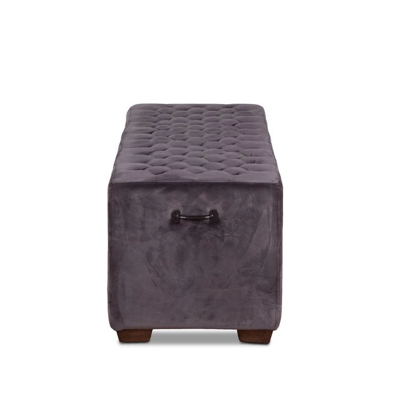 - Upholstered bench wrapped in sage green or asphalt gray high grade performance velvet