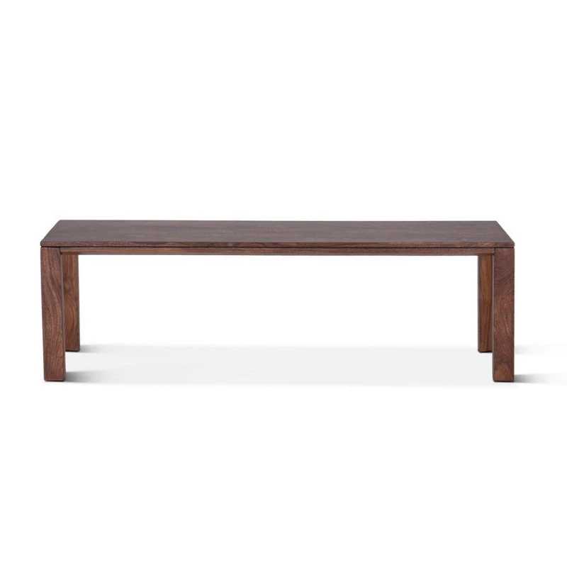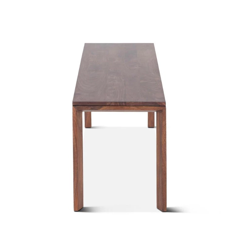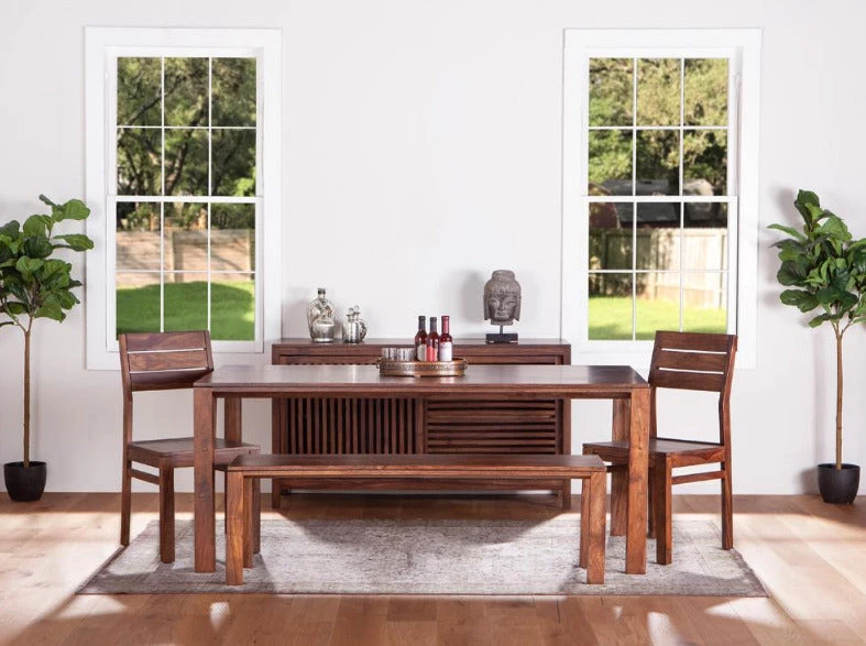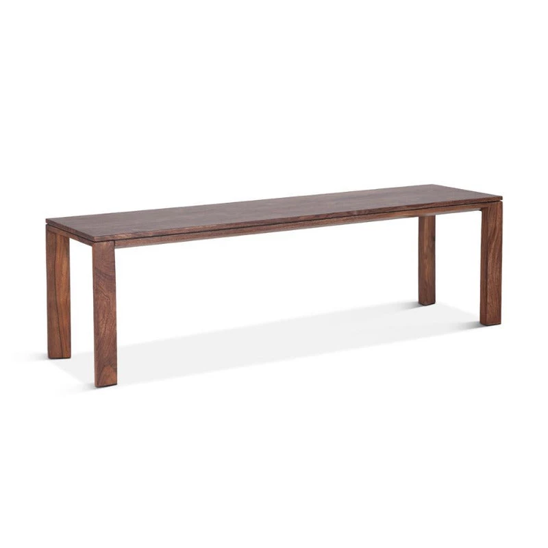 This beautiful yet simple dining bench is constructed entirely from solid Sheesham wood. The bench features four legs with each pair of legs carved from a single piece of wood with beveled design that carries all the way down the floor. The seat appears to be almost floating on the frame with beveled underneath and a panel design on the top, enhancing Japandi appeal that is perfect for your dining room.