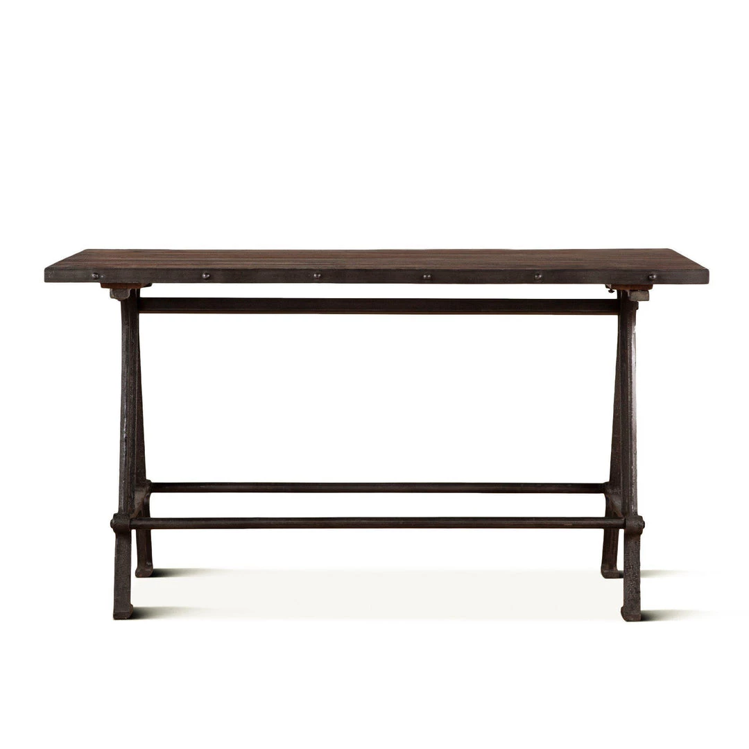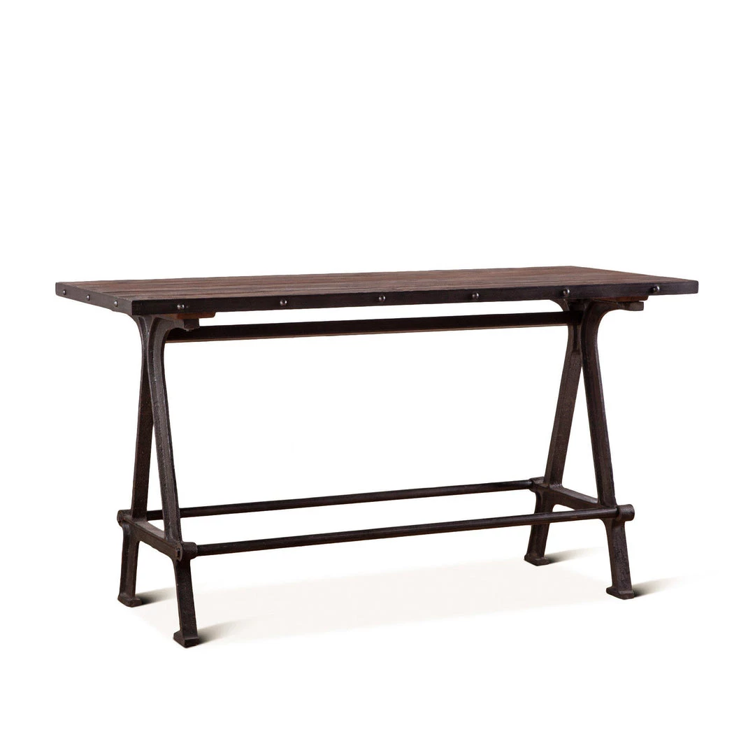 Crafted exclusively from reclaimed materials, each piece in the Paxton collection is visually stunning and is sure to make a lasting impact in your home. This gathering table’s top is framed in recycled iron with gray zinc finish, and the crossing legs with metal stretchers that double as footrests afford a level of comfort and fashionable stability. This handcrafted, counter-height dining table has a reclaimed teak wood top with a unique panel design. This gathering table requires assembly.
