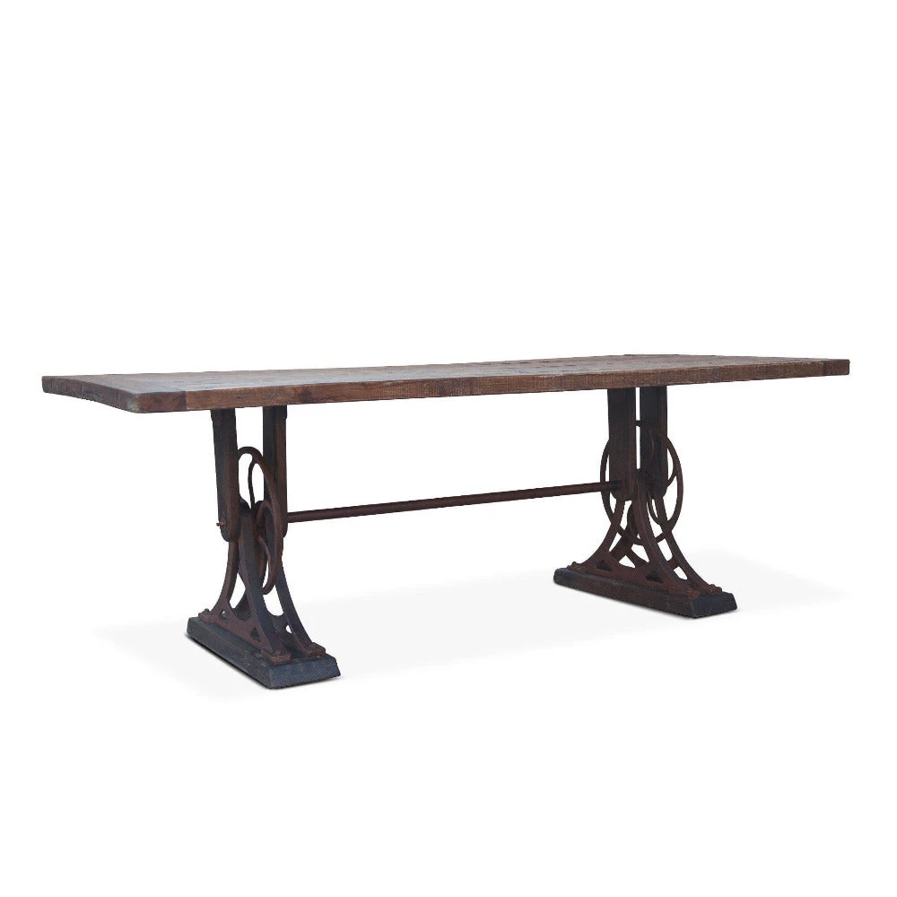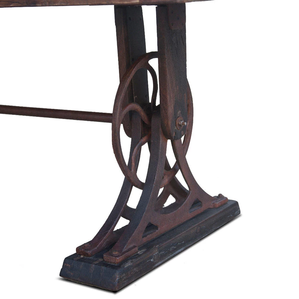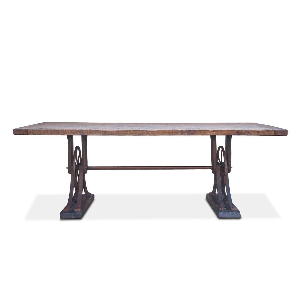 - Natural patina trestle base is fashioned from cast iron with an industrial wheel accent near the bottom