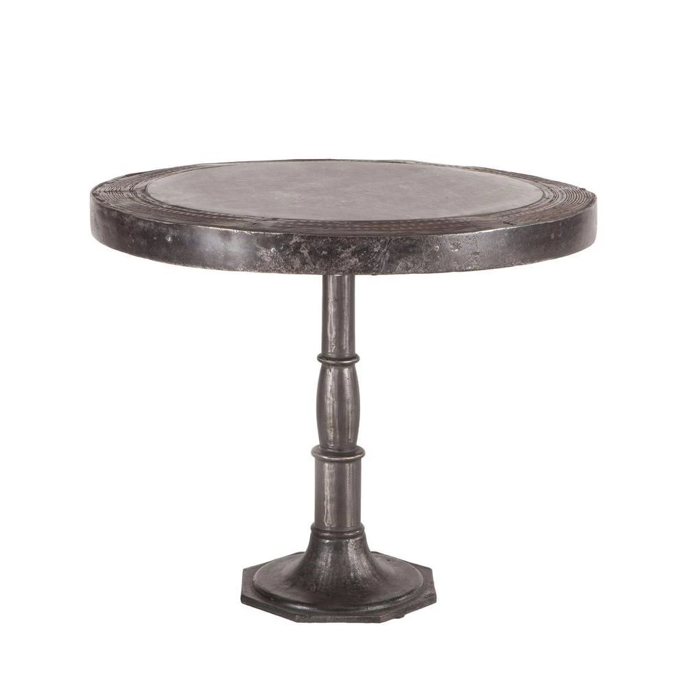 The antique-styled, hand-forged cast iron pedestal base in natural patina finish is designed to enhance the industrial look of the table. This round table requires assembly.