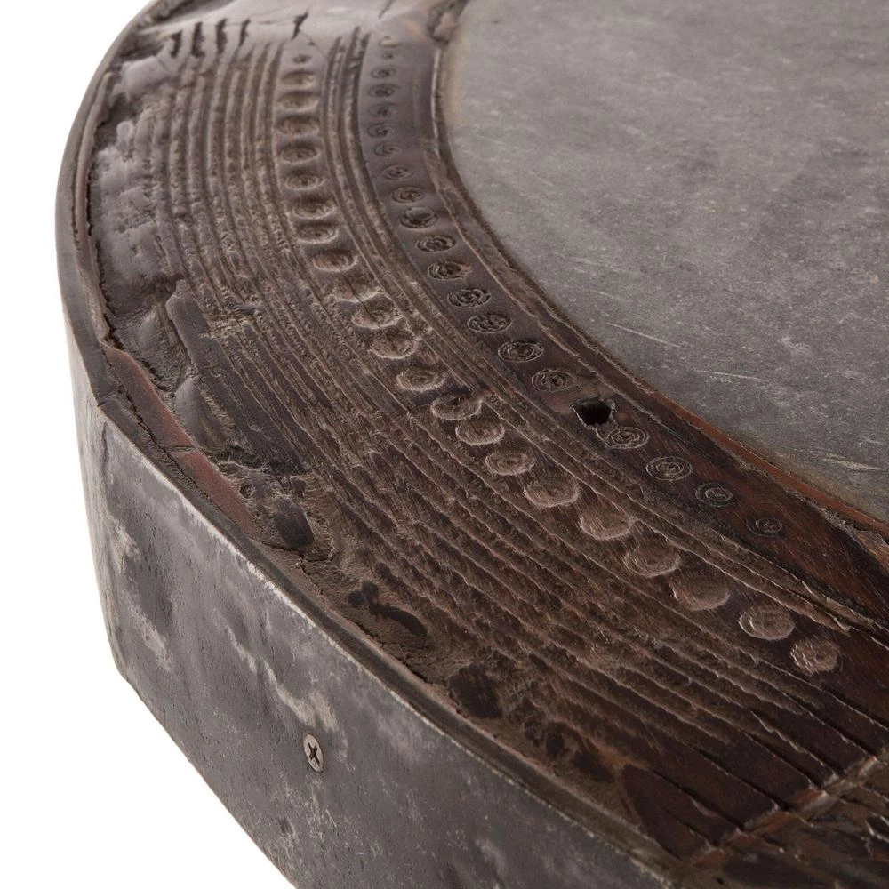 - 3″ thick reclaimed teak wagon wheels framed in a welded iron rim and inlaid with a natural white marble center.