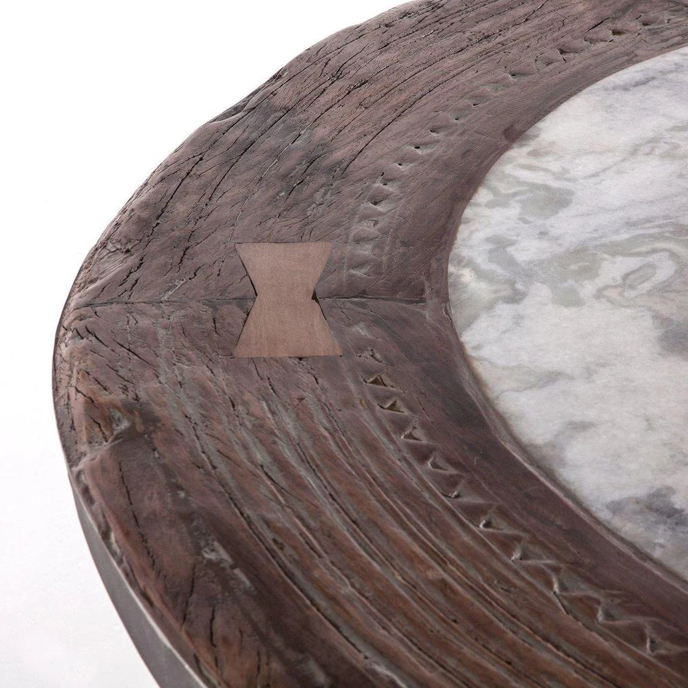 - 3″ thick reclaimed teak wood wagon wheels framed in a welded iron rim and inlaid with a natural white marble center.