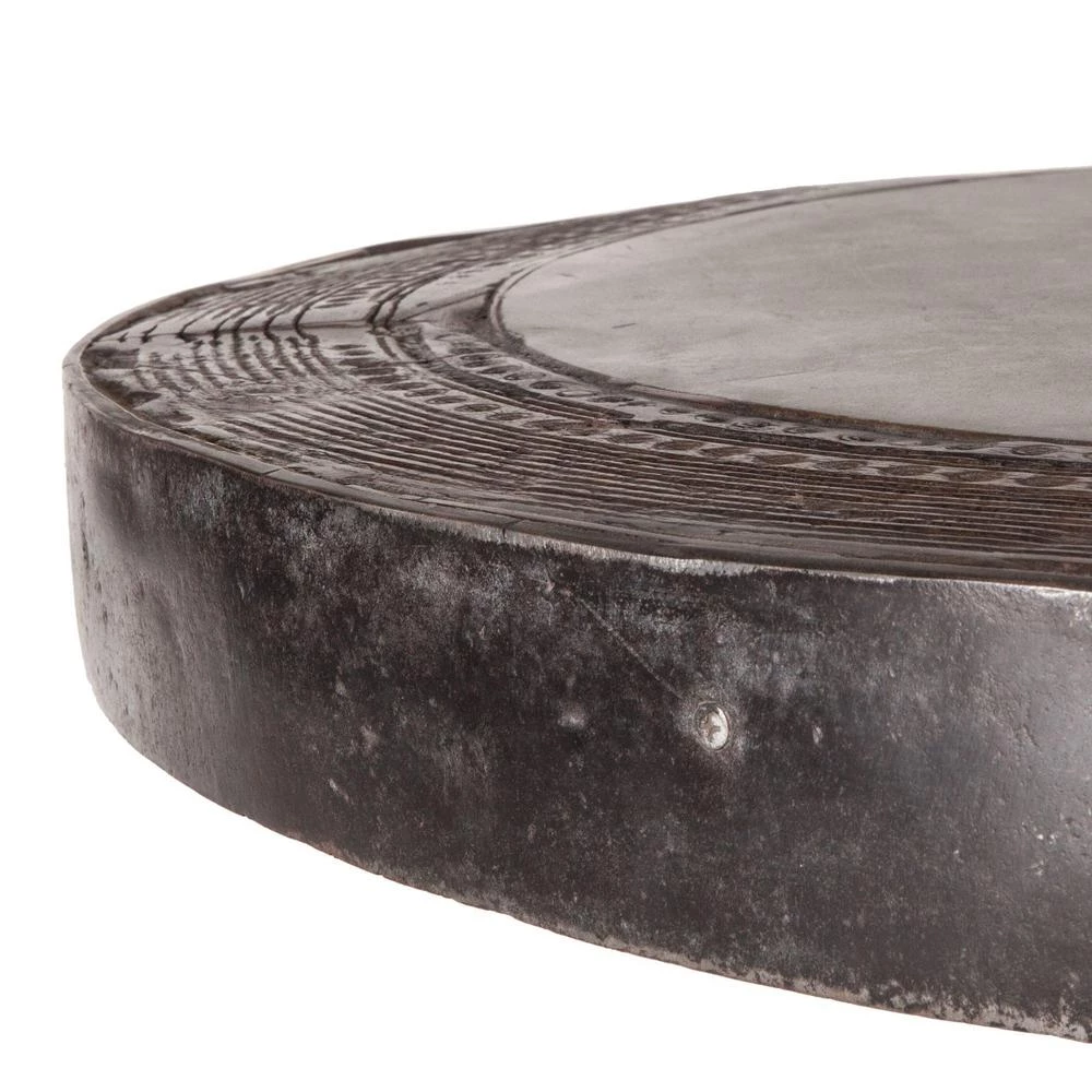The antique-styled, hand-forged cast iron pedestal base in natural patina finish is designed to enhance the industrial look of the table. This round table requires assembly