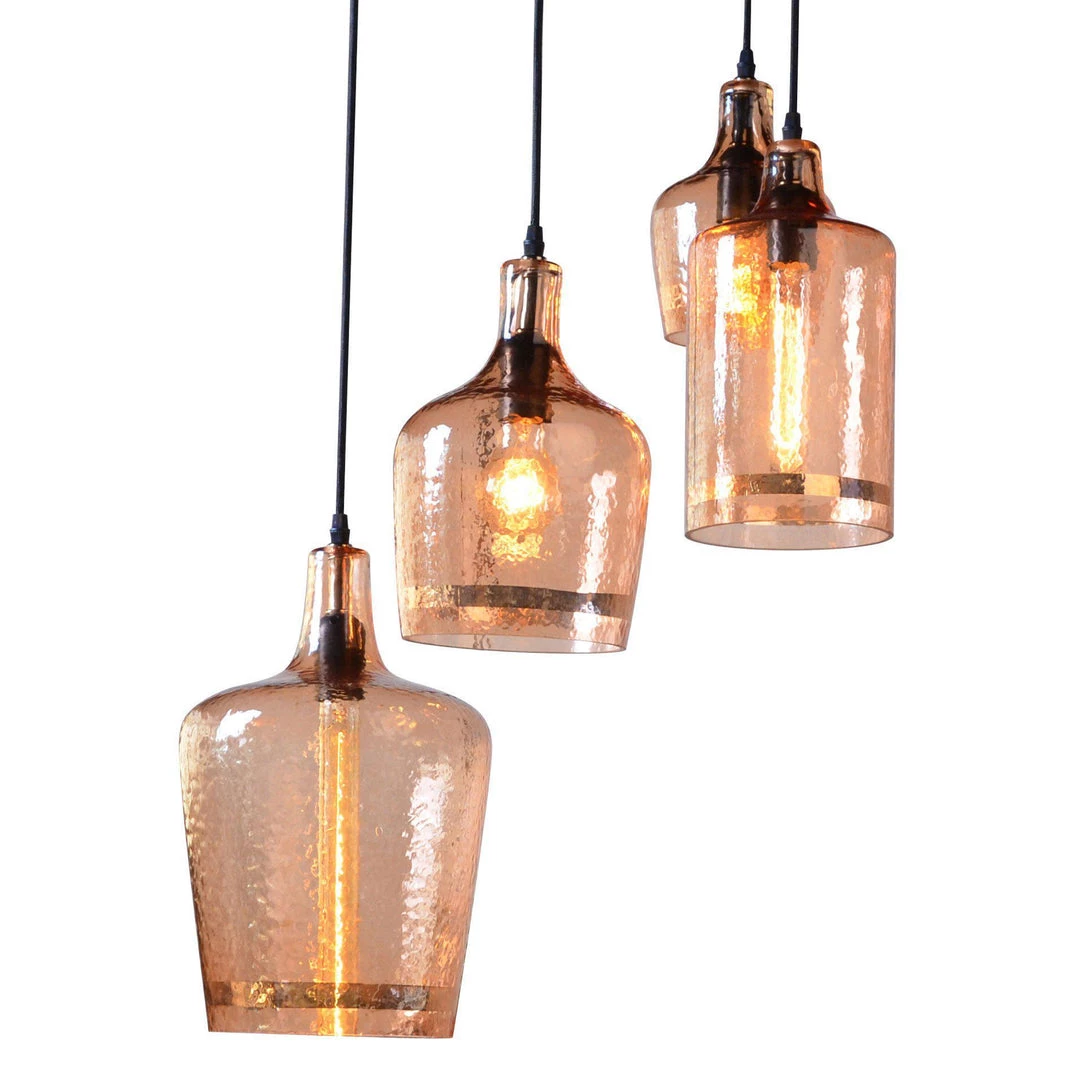 A perfect blend of industrial and modern elements, this beautiful multi-pendant ceiling light has four hanging Edison-style bulbs each with hammered glass shade in a metallic copper finish. The layered effect of this ceiling light is emphasized not only in the different levels that each pendant hangs from, but also in the varying sizes and shapes of the glass lamp shades. Electric powered and UL-listed for safety, this pendant light is sure to make a gorgeous and distinctive addition to any room of your choosing.