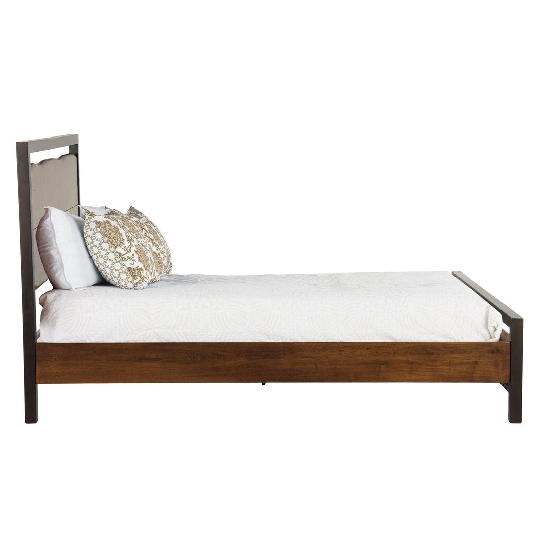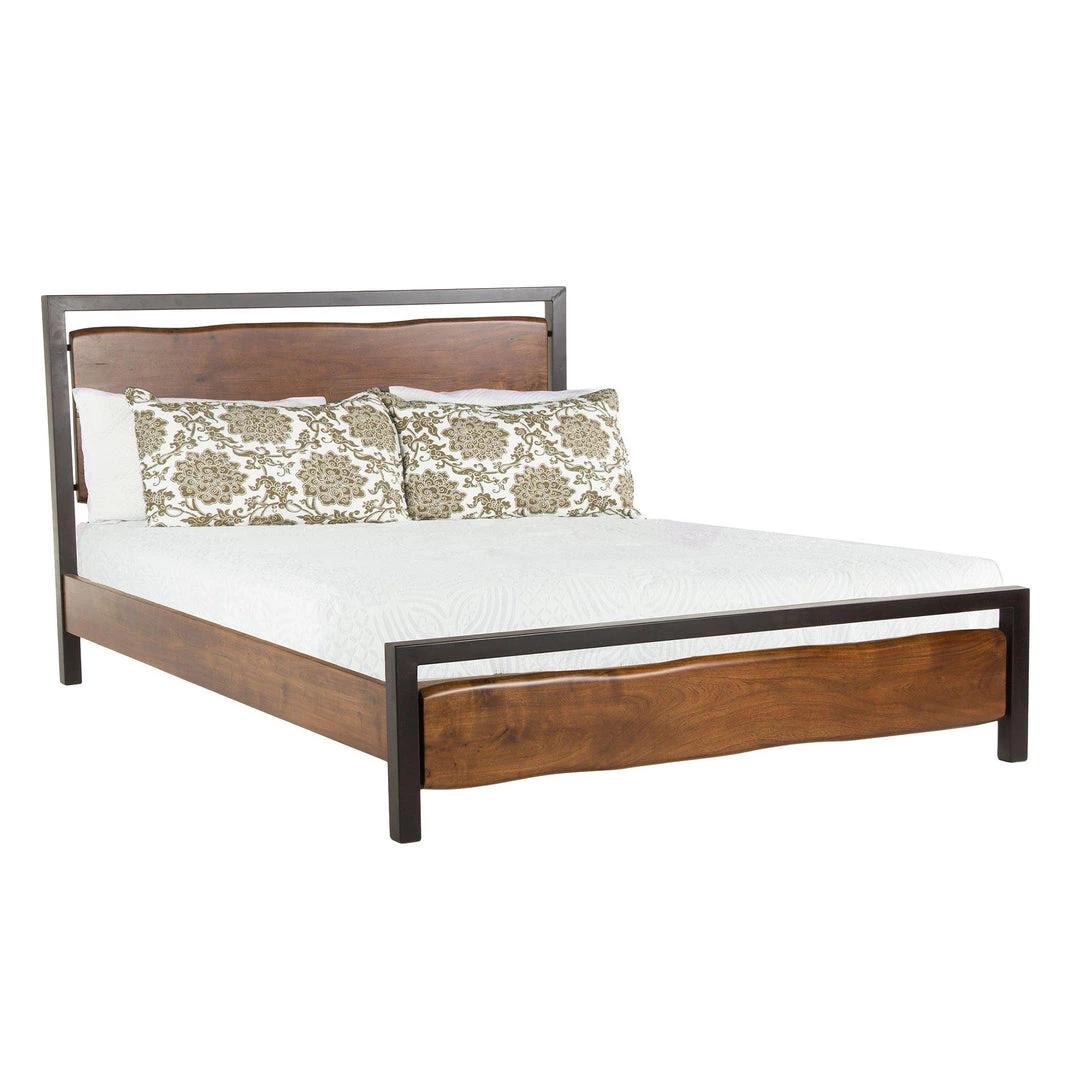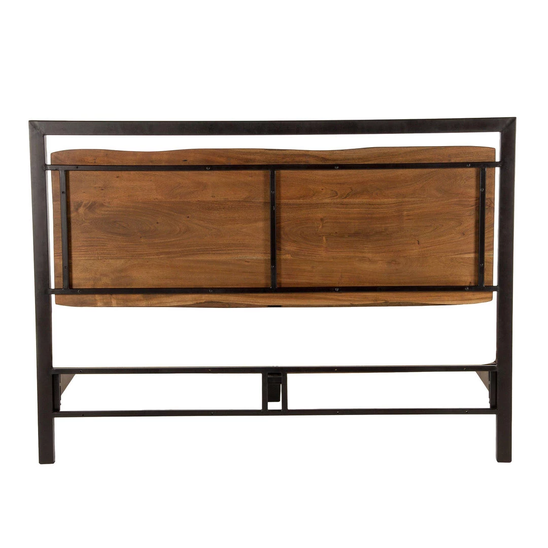 Combining organic silhouettes with modern details for a casual and transitional style, this hand-crafted faux live edge bed frame is made with acacia wood featuring uneven edges and butterfly joinery detailing on the headboard and footboard. The catalyzed water-based walnut finish on the wood creates an amazing luminosity that evokes beauty from every angle while also being durable for daily use. The headboard and footboard are each framed by square, U-shaped recycled iron tubing in antique zinc finish, creating a fusion of modern and contemporary elements. This bed frame requires assembly.