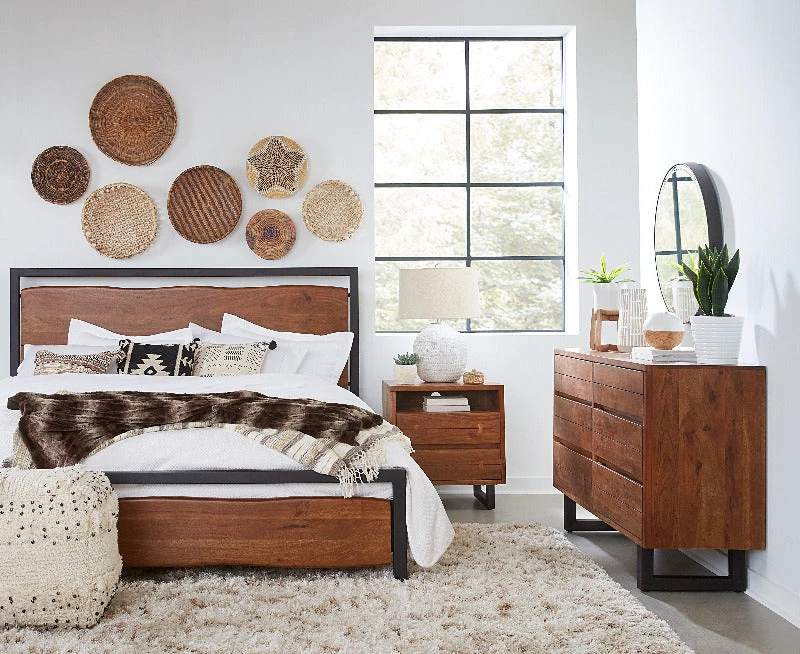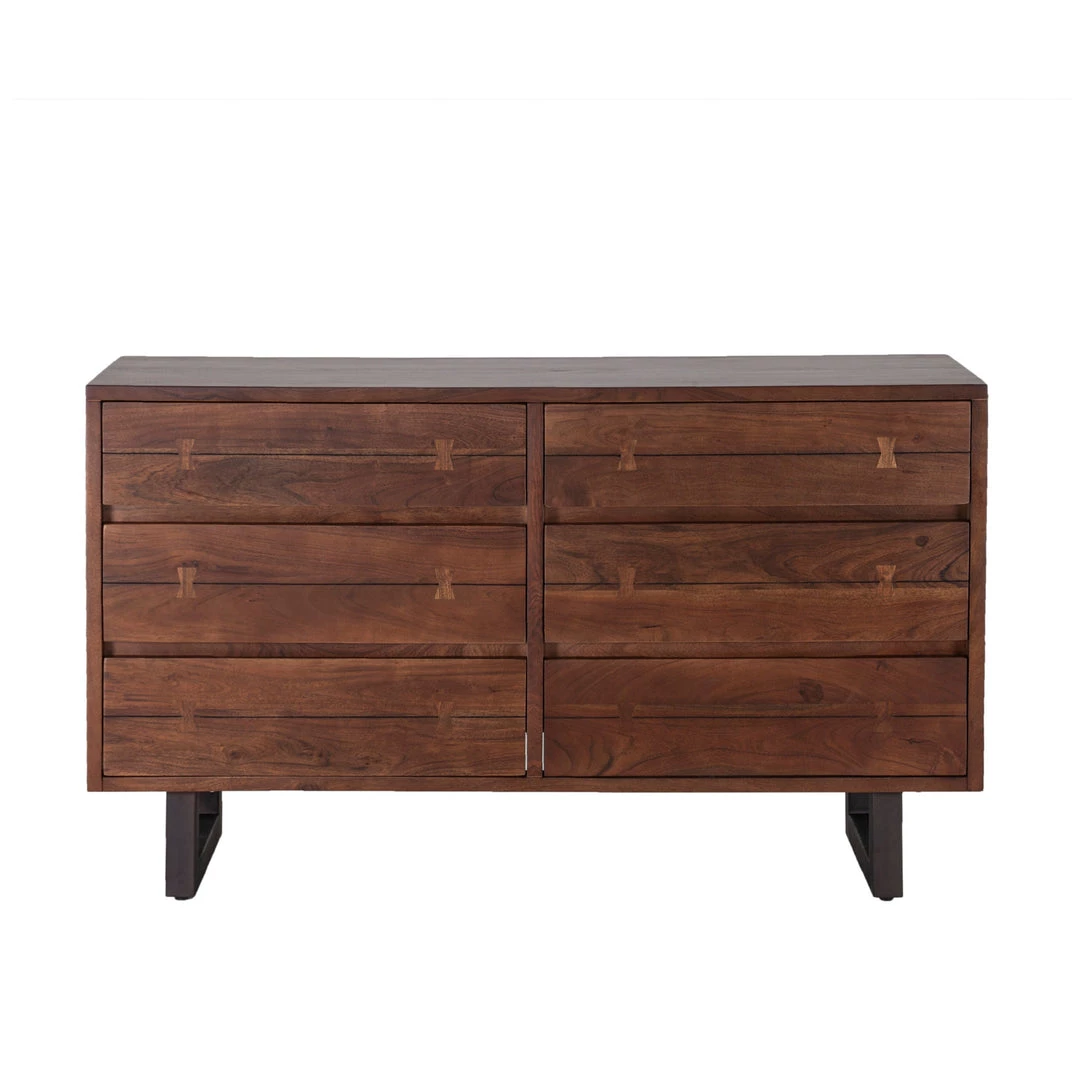 Combining organic silhouettes with modern details for a casual and transitional style, this hand-crafted faux live edge dresser is made with acacia wood featuring clean edges and butterfly joinery detailing on the drawers. The catalyzed water-based walnut finish on the wood creates an amazing luminosity that evokes beauty from every angle while also being durable for daily use. With six drawers, three stacked on either side and each with a simple and nearly invisible handle shaved into the top rim of the drawer, this dresser provides plenty of room for all your clothes. The dresser rests atop a pair of reclaimed iron U-shaped legs in antique zinc finish, creating a fusion of modern and contemporary elements. This dresser is pre-assembled.