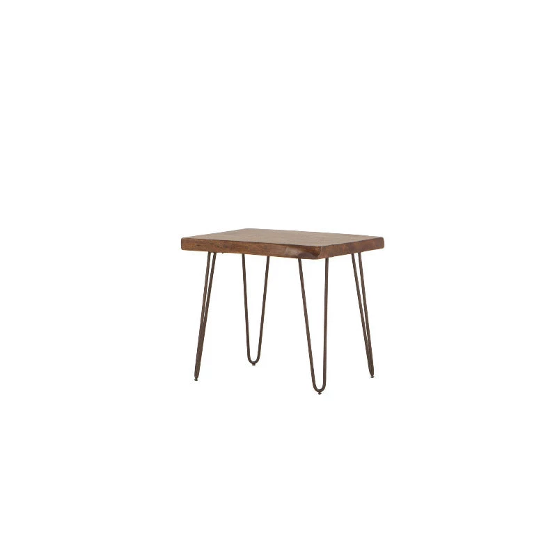 With its live-edge and dynamic acacia wood grain, this durable wood supported by hairpin legs is the highlight of all pieces in this collection. This side table has a solid acacia wood table top that features curved edges to highlight the live edge effect and provide a refined appearance. The antique zinc steel hairpin legs provide a modern balance to the natural materials. This side table requires some light assembly.