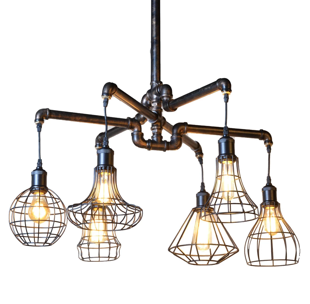 Each piece in the Element collection blends contemporary designs with old world charm to create not only an artistic illumination piece, but a unique focal point to every room in your home. Beautiful ironwork and rustic finishes in a variety of colors and materials make each piece in this industrial style collection captivating. A perfect blend of industrial and pipe elements, this wonderfully large multi-pendant chandelier includes six hanging Edison-style bulbs, each with an open-work wire lamp shade in varying sizes and shapes. This chandelier is uniquely versitile with each pendant connected by wire to a pipe that can swivel 360°, affording you the ability to arrange the pendants however you wish. Electric powered and UL-listed for safety, this industrial style chandelier is sure to make a gorgeous and distinctive addition to any room of your choosing.
