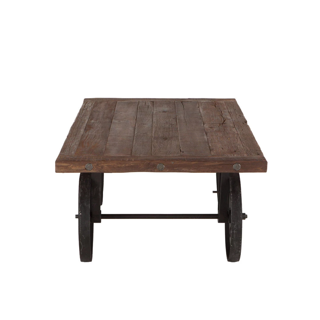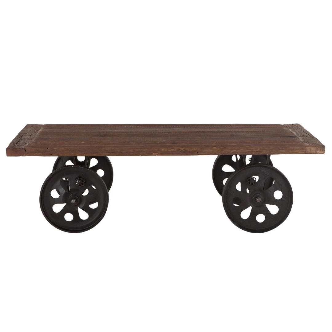 This coffee table’s legs are wheels of recycled iron in antique zinc finish, which are operable affording ease of transportability. The coffee table features a panel design in the reclaimed teak on the table top that is wrapped in a water-based, catalyzed, natural teak finish offering durability for daily use. Arriving pre-assembled and ready to place, and with materials of the finest quality, this unique industrial coffee table will be an effortless addition to any home.