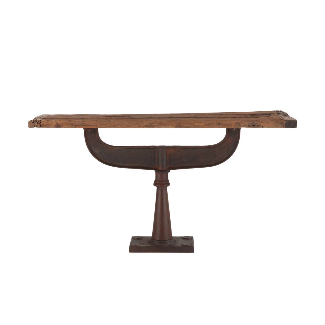 This hand-crafted console table has a reclaimed teak wood table top featuring authentic wood cracks and knots, and the water-based, catalyzed, raw natural finish on the wood offers durability while showcasing the natural grain of the wood. The pedestal base is hand-forged iron in an antique rust finish, creating a beautiful fusion of natural and industrial elements with the teak wood top. This table requires some assembly.