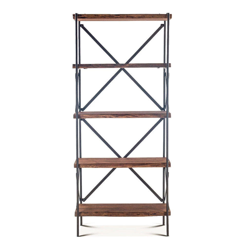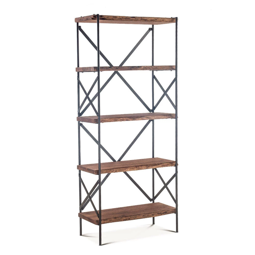 Handcrafted from thick acacia wood slabs that rest atop a reclaimed cast iron base, the Blayne collection features a genuine live-edge that further enhances the natural beauty of each piece. Standing at 78-inches tall, the Blayne bookcase features four live edge shelves in a natural, raw walnut finish creating a rugged and textured effect that can be felt and seen from every angle. Place against an off-white or gray wall to complement the antique zinc finish of the iron frame and let the wall show through the openwork design. This bookshelf requires assembly.