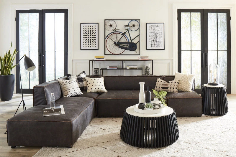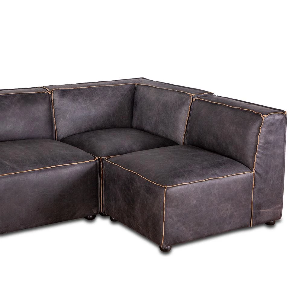 This retro-industrial styled modular top-grain leather sectional comes with four pieces including: armless chair, corner, armless loveseat, and half back chaise. Each piece features two retractable hinged metal hooks that extend out from below allowing all pieces to be fastened securely together or to hide away when standing alone. This sectional requires no assembly. Elegance meets modern retro design to make an effortless addition to any home.