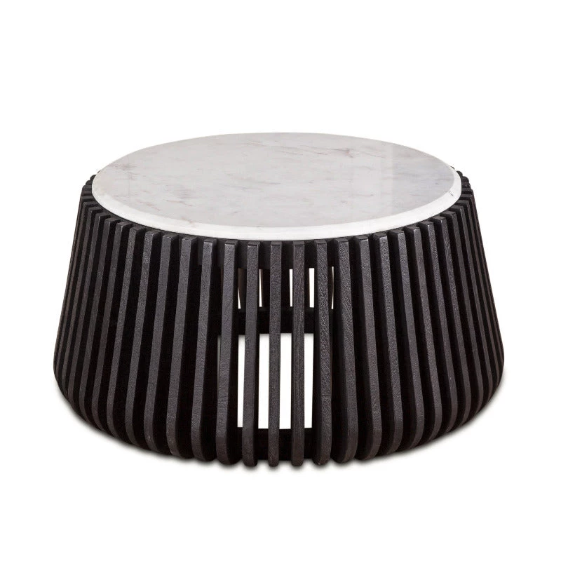 The Lisbon collection coffee table features solid mango wood base and a natural stone marble top. The mid-century modern design of the furniture in the Lisbon collection features simple clean lines and an open airy feel, lending to the contemporary-modern look.