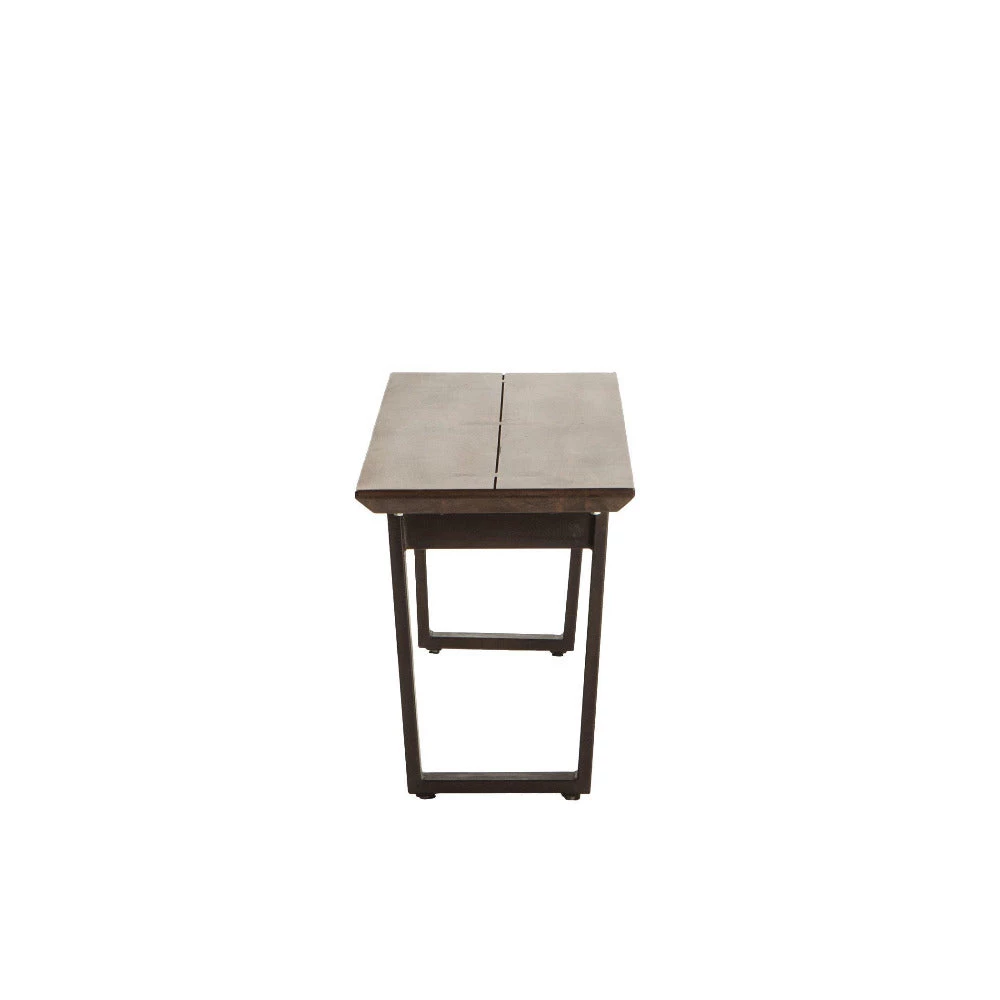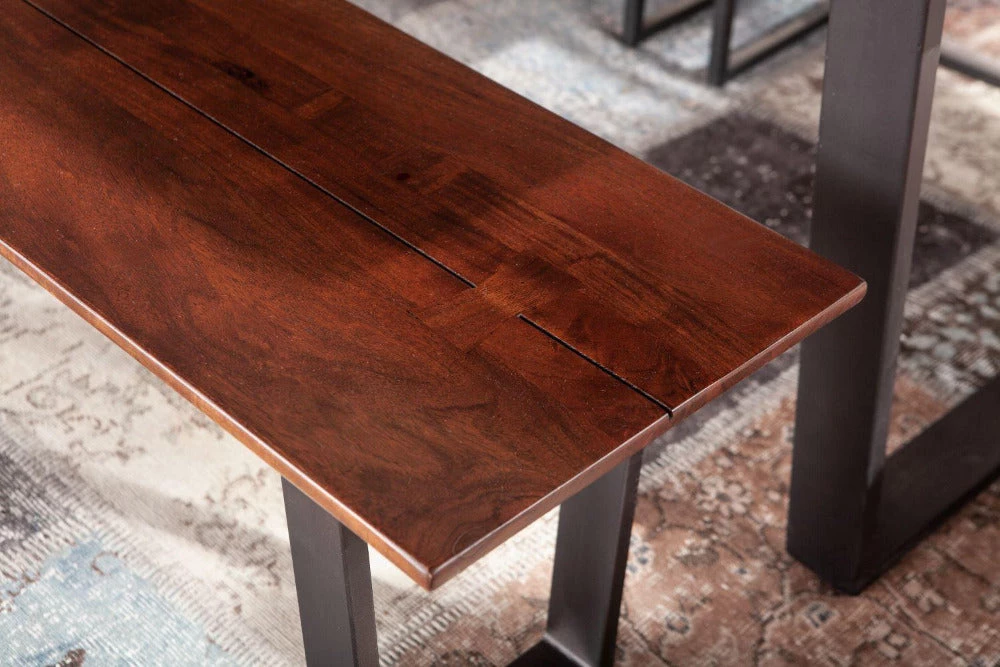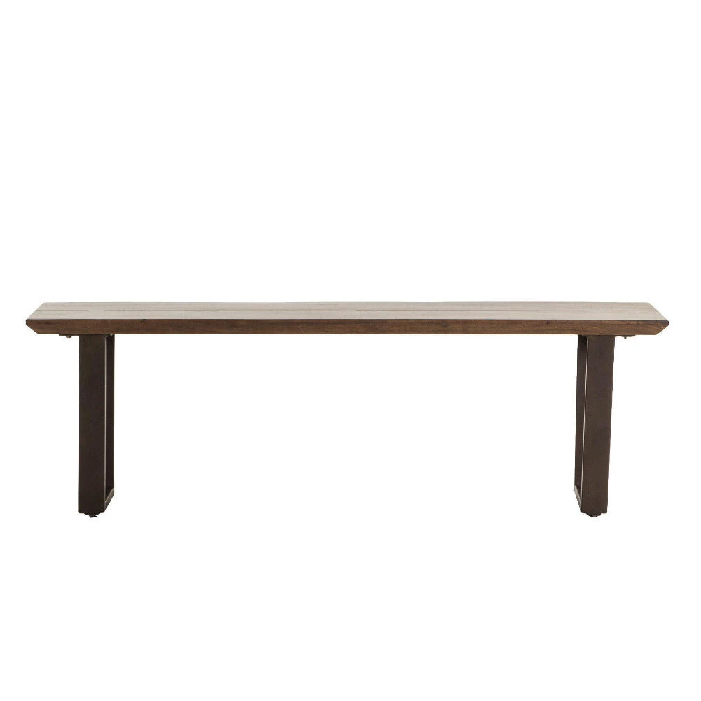 With a classic charm and air of sophistication, this handcrafted live edge styled bench is cut from a solid acacia wood slab featuring sleek beveled edges and butterfly joinery detailing. The water-based catalyzed walnut finish on the wood creates an amazing luminosity that evokes beauty from every angle while also being durable for daily use. The bench’s seat sits atop two dark gray U-shaped legs creating a fusion of natural and industrial elements. This bench requires some assembly.