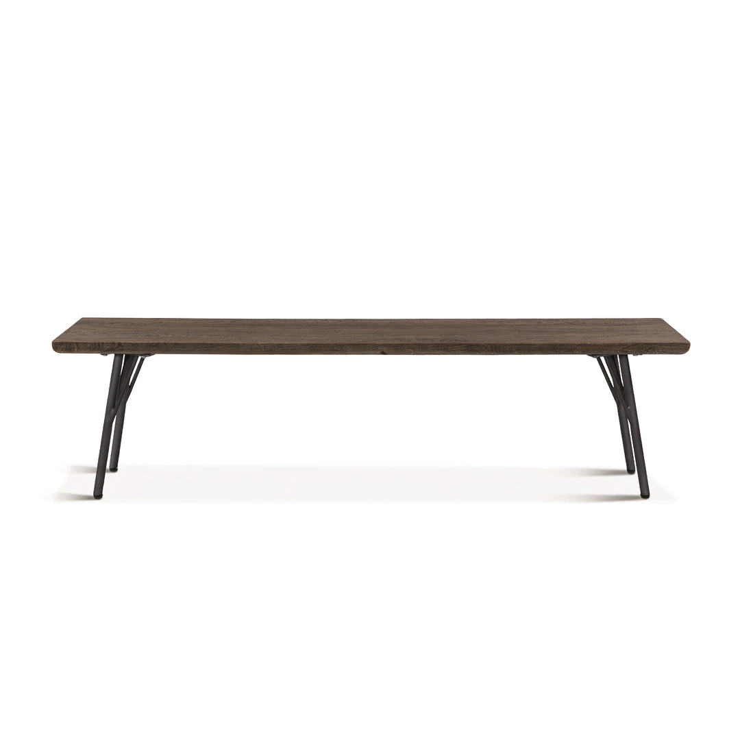 The Melbourne collection fuses industrial modern and mid-century designs. This collection features materials like solid mango wood and welded iron, hard leather and soft suedes, all combined to create distinct looks that appeal to the modern eye. This beautiful yet simple dining bench has a solid mango wood seat, and the water-based, catalyzed weathered teak finish offers durability while showcasing the natural grain and coloration of the wood. The bench features four black legs of reclaimed iron, enhancing the mid-century modern look of the piece. This bench requires some light assembly to affix the legs to the seat, and it is made with materials of the finest quality, making it an effortless addition to any home.