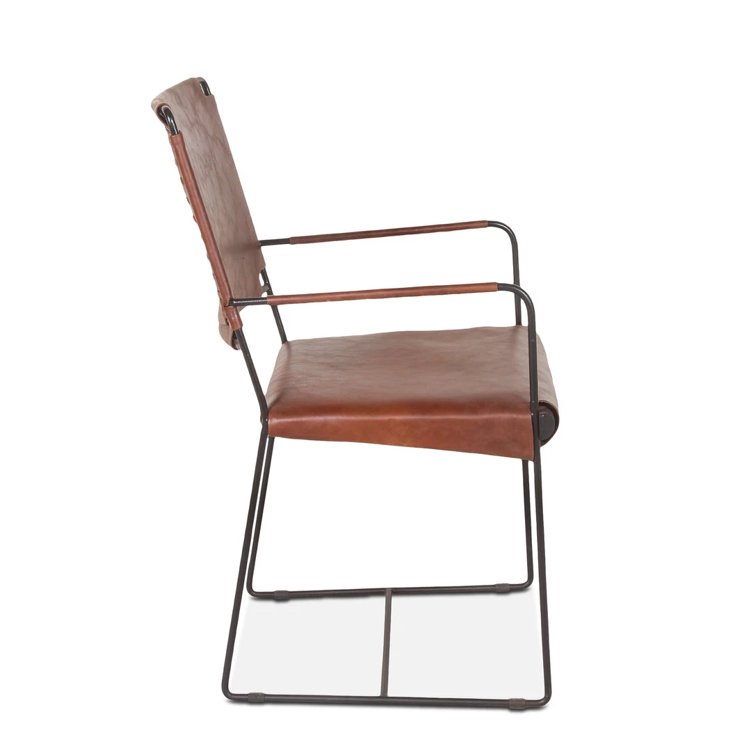 The Melbourne collection fuses industrial modern and mid-century designs. This beautiful yet simple armchair has a black reclaimed iron frame with sled style legs, enhancing the mid-century modern look of the piece. The seat and seat back are upholstered in a luxuriously leather and the seat includes a cushion for comfort and support. This sleek dining chair is pre-assembled and made with materials of the finest quality, making it an effortless addition to any home.