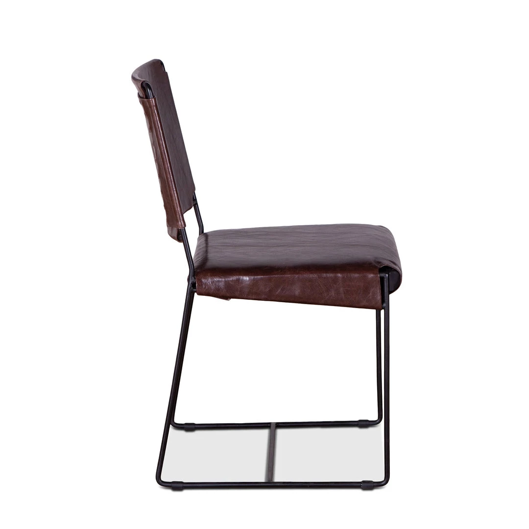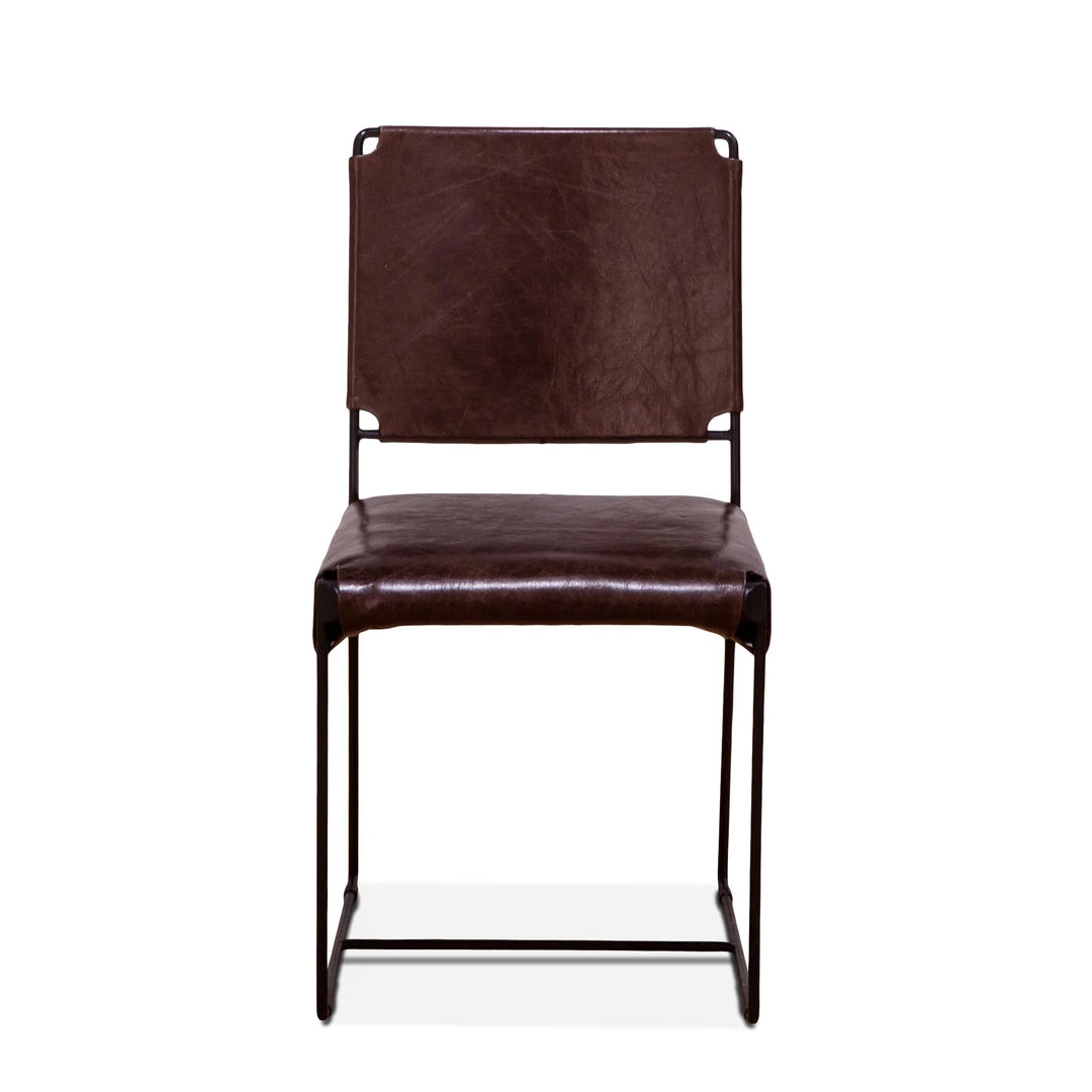 The Melbourne collection fuses industrial modern and mid-century designs. This beautiful yet simple dining chair has a black reclaimed iron frame with sled style legs, enhancing the mid-century modern look of the piece. The seat and seat back are upholstered in a luxuriously goat leather, and the seat includes a cushion for comfort and support. This sleek dining chair is pre-assembled and made with materials of the finest quality, making it an effortless addition to any home.