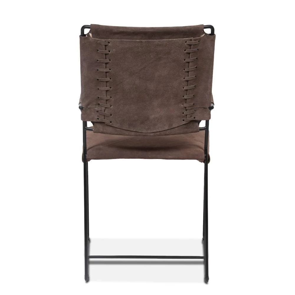 The Melbourne collection fuses industrial modern and mid-century designs. This collection features materials like solid mango wood and welded iron, hard leather and soft suedes, all combined to create distinct looks that appeal to the modern eye. This beautiful yet simple armchair has a black reclaimed iron frame with sled style legs, enhancing the mid-century modern look of the piece. The seat and seat back are upholstered in a luxuriously soft, asphalt gray suede material, and the seat includes a cushion for comfort and support. This sleek dining chair is pre-assembled and made with materials of the finest quality, making it an effortless addition to any home.