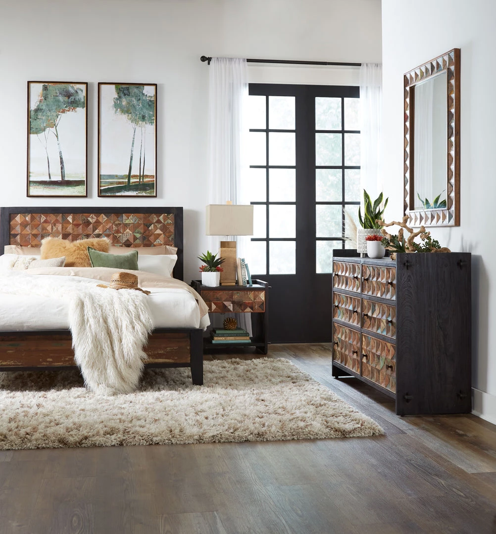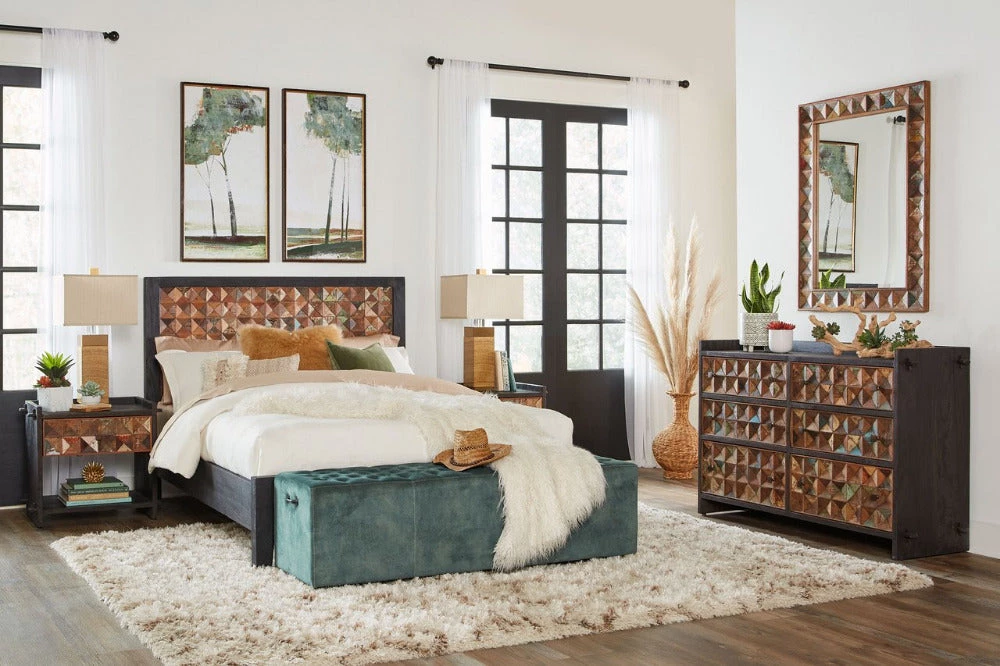 The Messina collection blends modern design with reclaimed elements. Multi-colored carved, reclaimed teak wood combines with mango wood in a rich java finish to create a sophisticated yet colorful collection. The tenon joinery and dovetail construction of the wood showcase the superior quality of this collection. Across the headboard is a unique, carved pattern of reclaimed teak wood in multiple colors. Due to the handcrafted nature of this item, variations will occur and are part of the unique character in this collection. Assembly required.