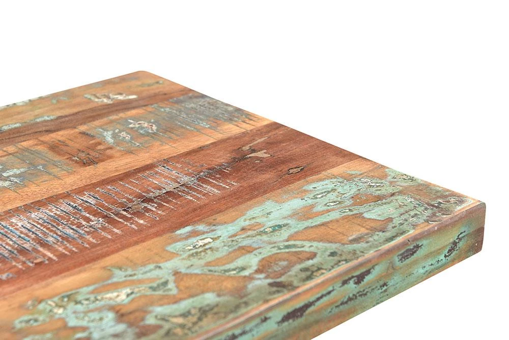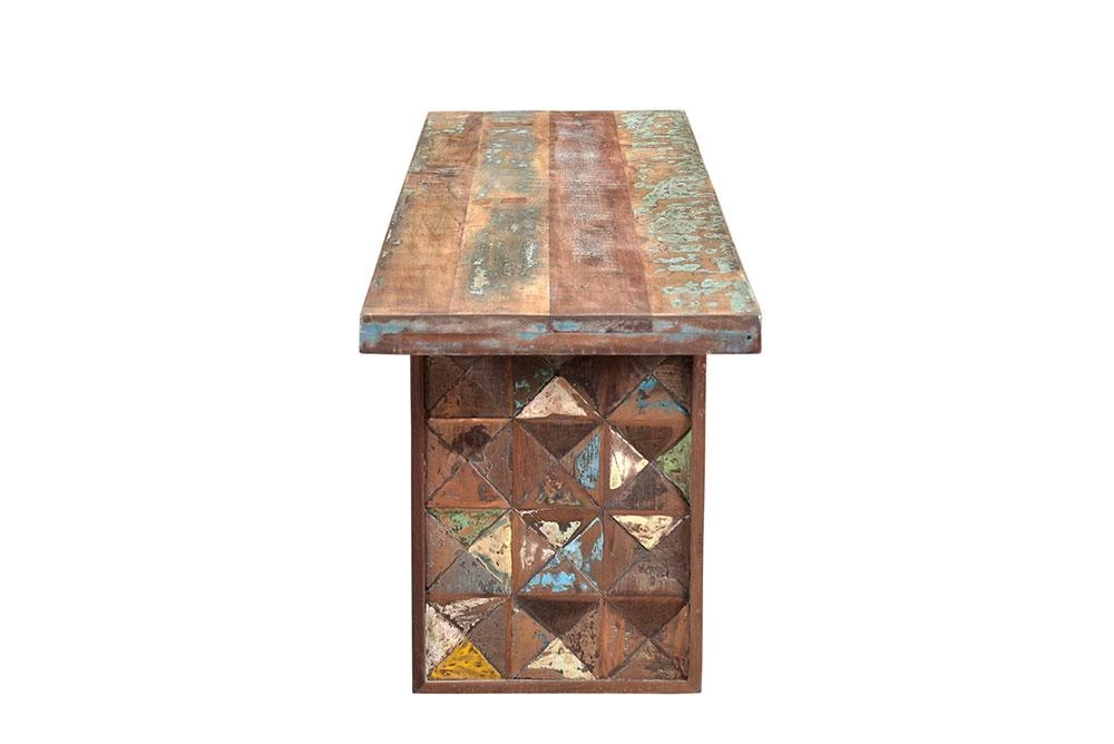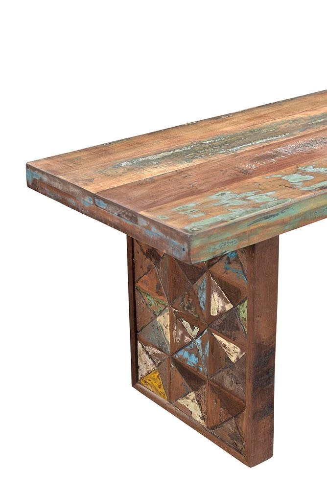 - Carved reclaimed teak block legs have multi-color elements, making each piece unique