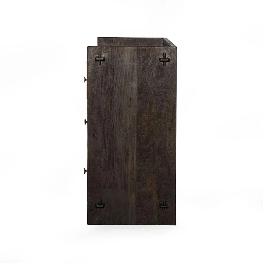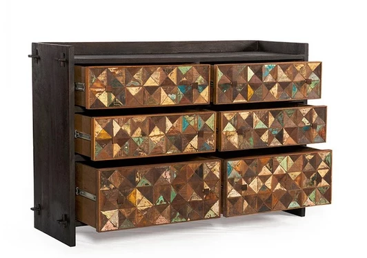 The Messina collection blends modern design with reclaimed elements. Multi-colored carved, reclaimed teak wood combines with mango wood in a rich java finish to create a sophisticated yet colorful collection. The tenon joinery and dovetail construction of the wood showcase the superior quality of this collection. This hand-crafted dresser is fashioned with a mango wood frame in a java finish that offers durability while showcasing the natural beauty and grain detailing in the wood. Across the front of the six drawers is a unique, carved pattern of reclaimed teak wood in multiple colors. This dresser is pre-assembled.