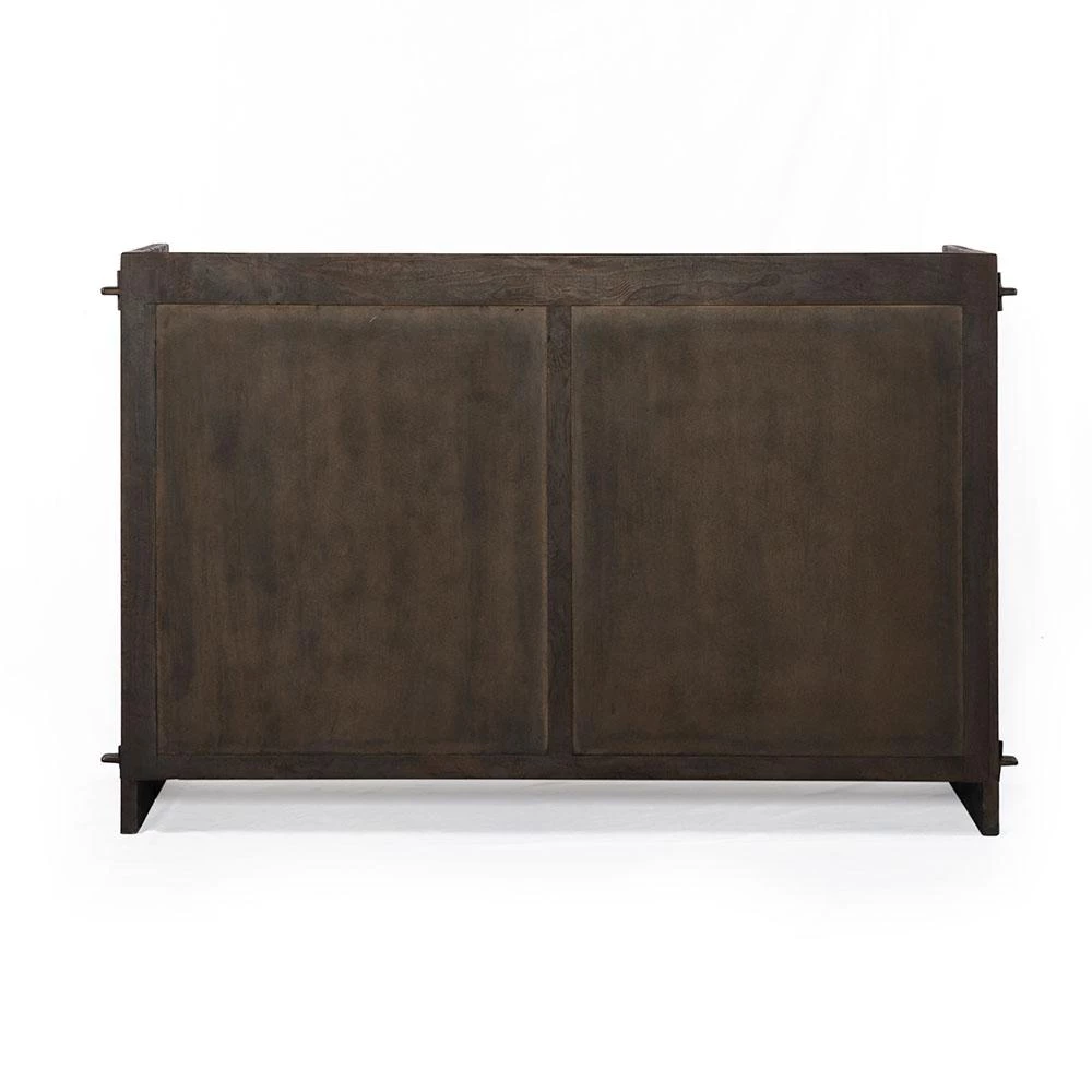 - Carved reclaimed teak wood drawer front has multi-color elements with bronze wood drawer knobs