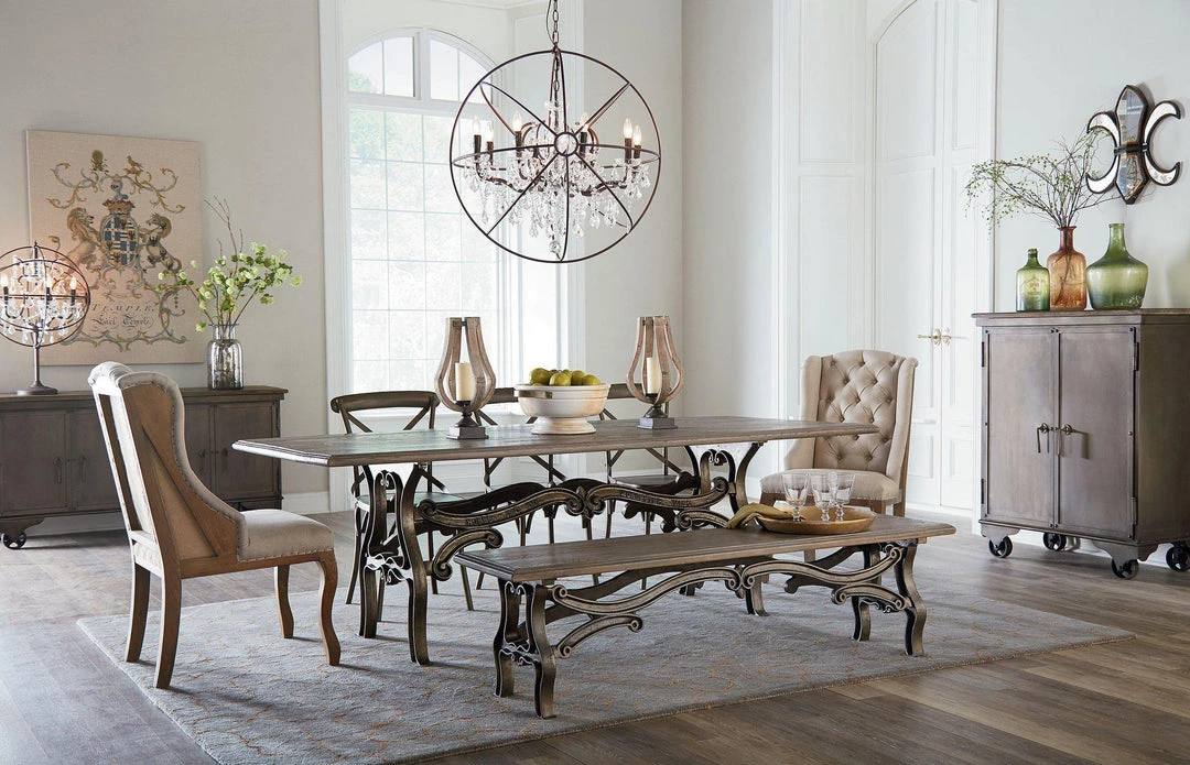 - Vintage styled reclaimed iron legs in gun metal finish match harmoniously with the weathered gray finish of the wood