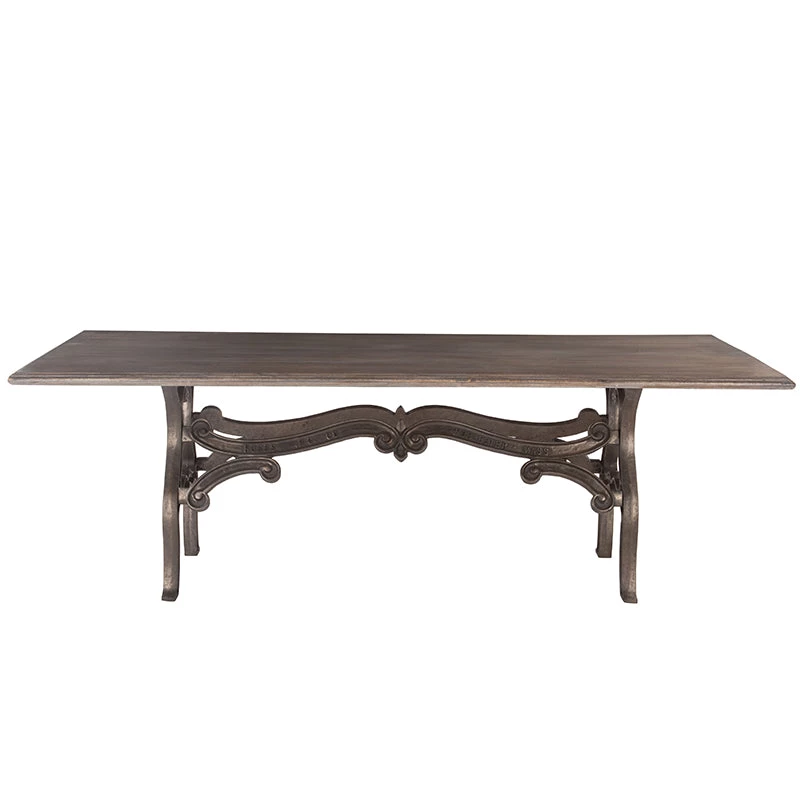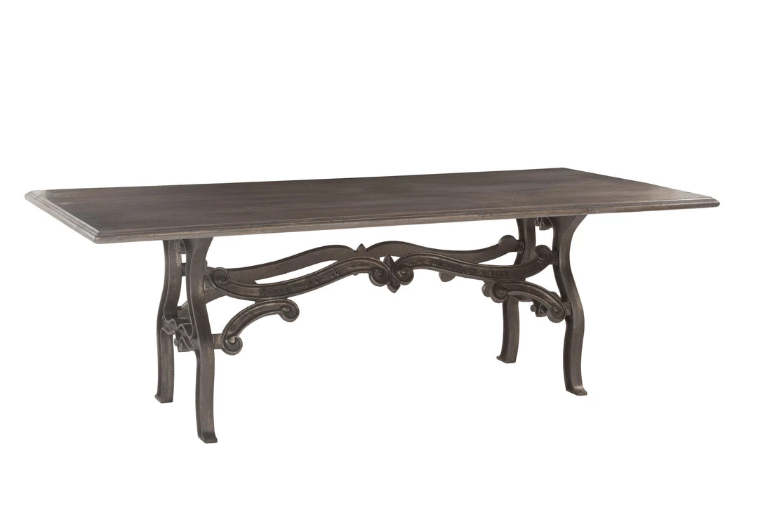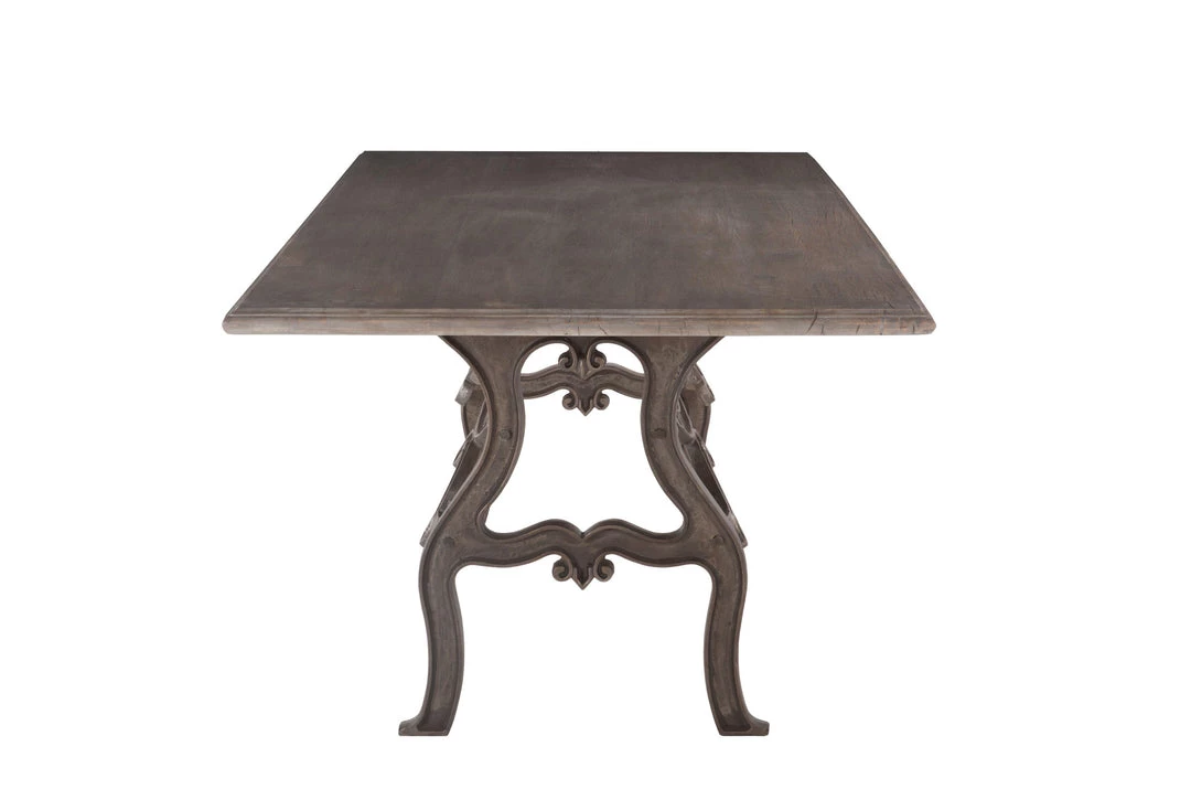 Constructed entirely from eco-friendly, natural and reclaimed materials, this hand-crafted table has a solid reclaimed oak wood table top in a water-based catalyzed, weathered gray finish, and features decorative beveled edges that highlight the reclaimed materials and vintage design. The table top rests atop a vintage-styled decorative base made of reclaimed iron in a beautiful gun metal finish with rivet detailing within the unique yet classic designed stretchers. The vintage industrial design of this dining table pairs perfectly with Nantes collection chairs or benches. Hand-crafted metalwork brings each piece to life, creating visually stunning furniture that will make a lasting impact.