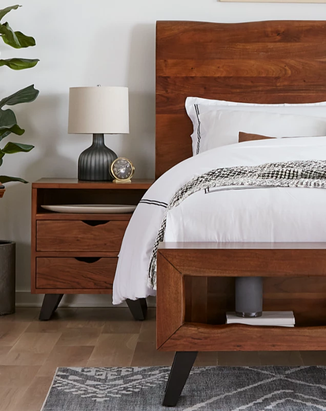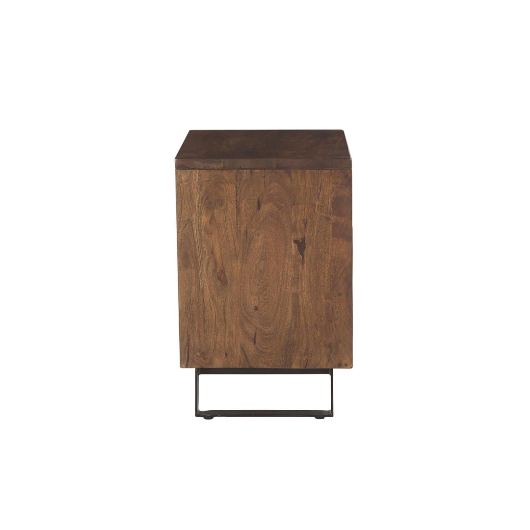 With a classic charm and air of sophistication, this hand-crafted night chest is made solid acacia wood in a water-based catalyzed finish that offers durability while showcasing the natural grain of the wood. With one slim cubby hole lining the top and two drawers stacked along the bottom, each featuring a unique yet sleek cut-out handle. The night chest rests on a pair of U-shaped, sleek iron legs to create a fusion of natural and industrial elements. This night chest is pre-assembled.
