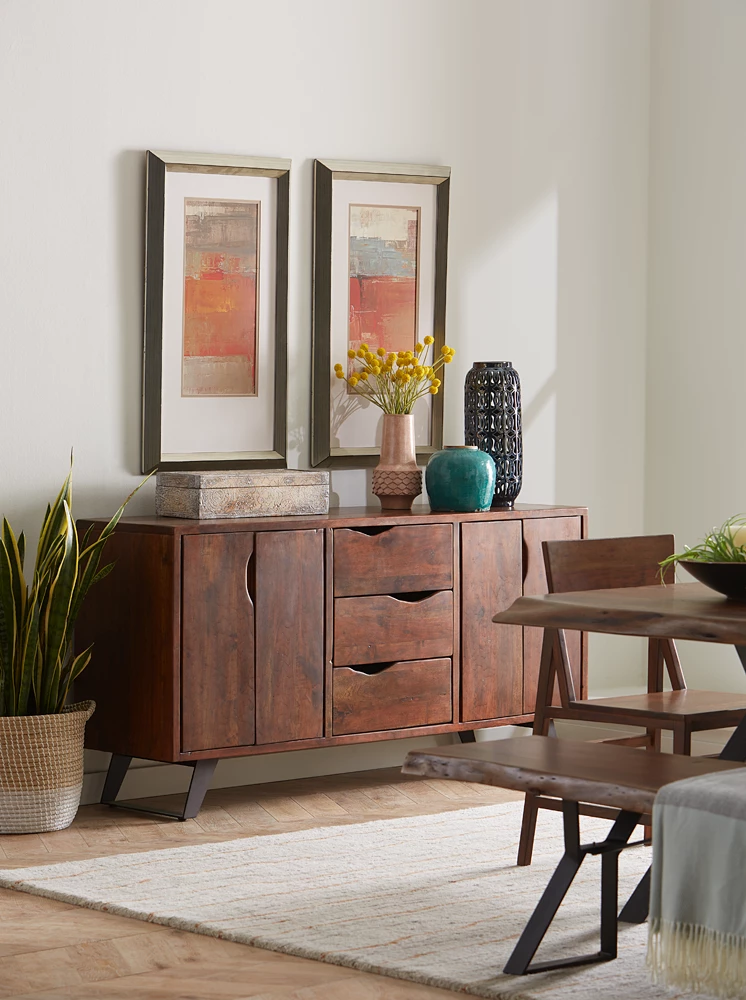 - Sideboard includes two cupboard areas lining the sides and three drawers stacked along the center