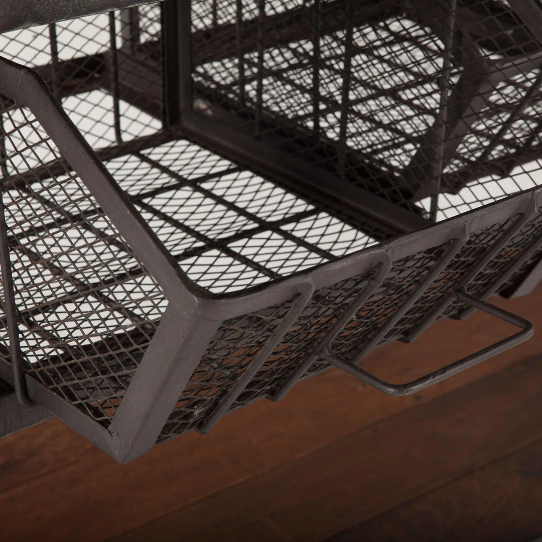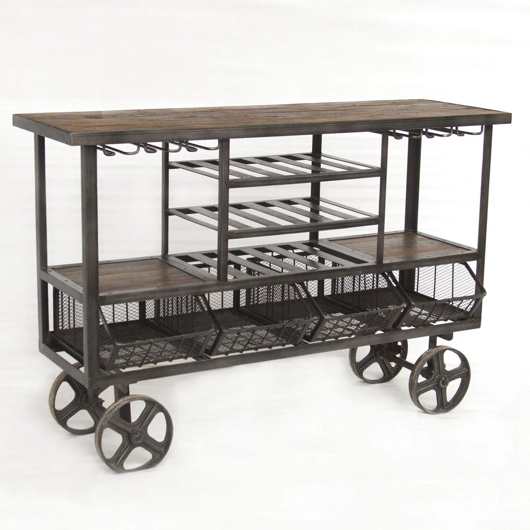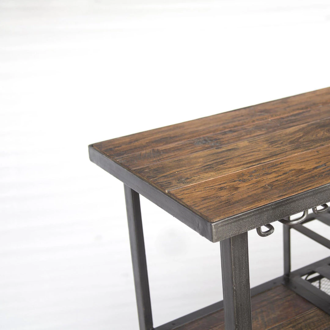 Crafted exclusively from reclaimed materials, each piece in the Paxton collection is visually stunning and is sure to make a lasting impact in your home. With two pairs of three metal glass racks affixed to the base of the top, you can hold all your favorite wine, margarita and martini glasses in one place. The utility cart features a panel design in the reclaimed teak on the top, middle and bottom shelves. Use this large bar cart to accent any room in your home with a moveable, industrial piece of furniture.