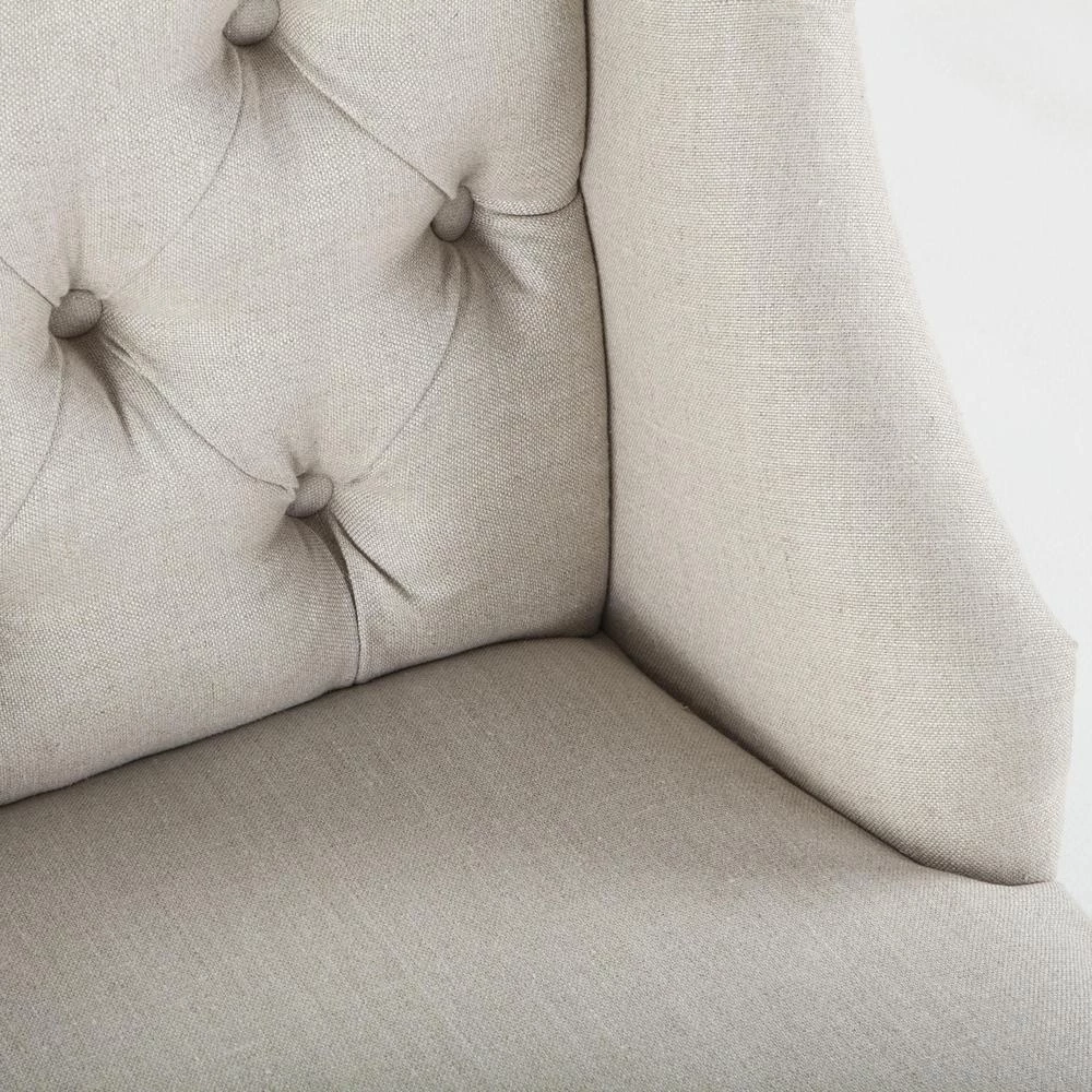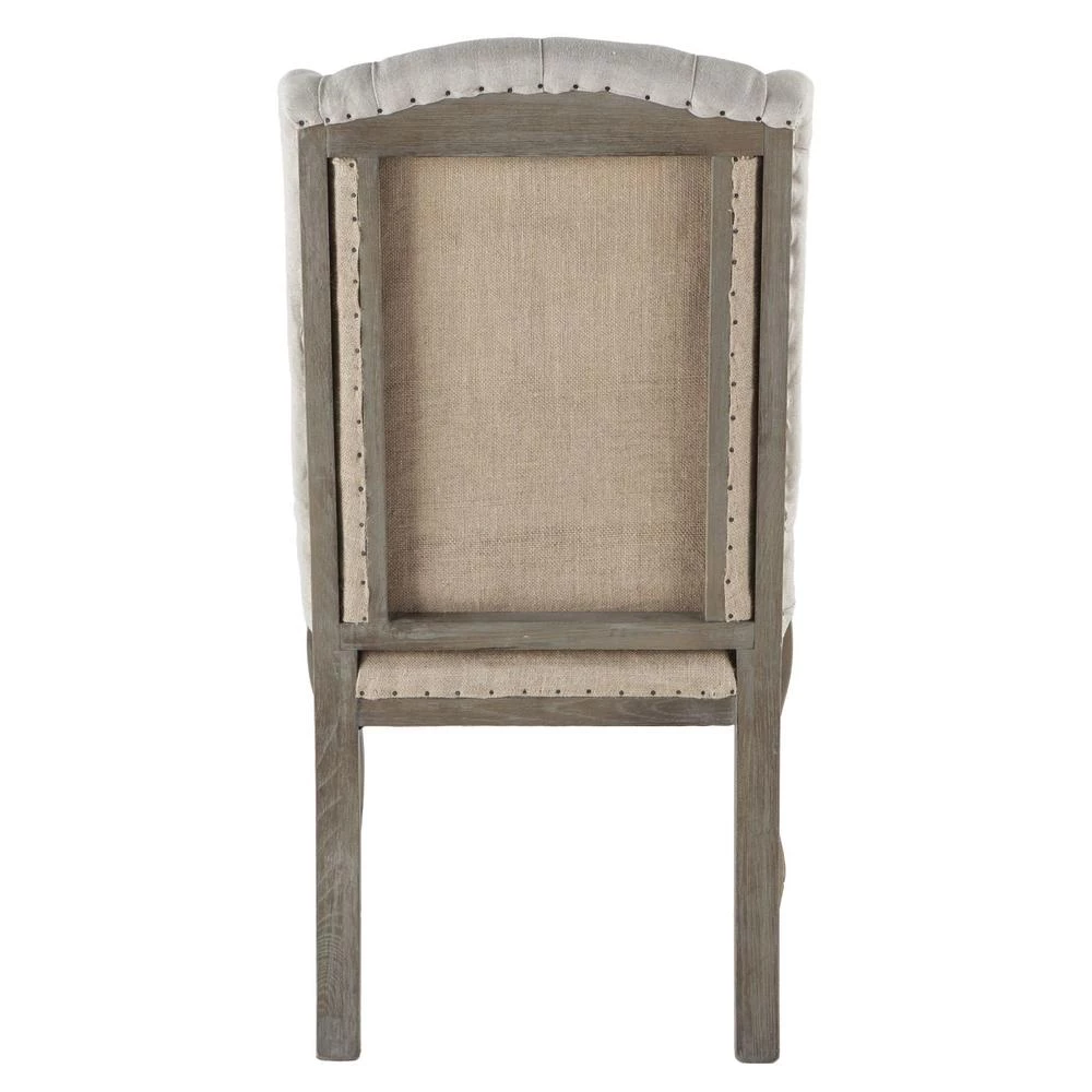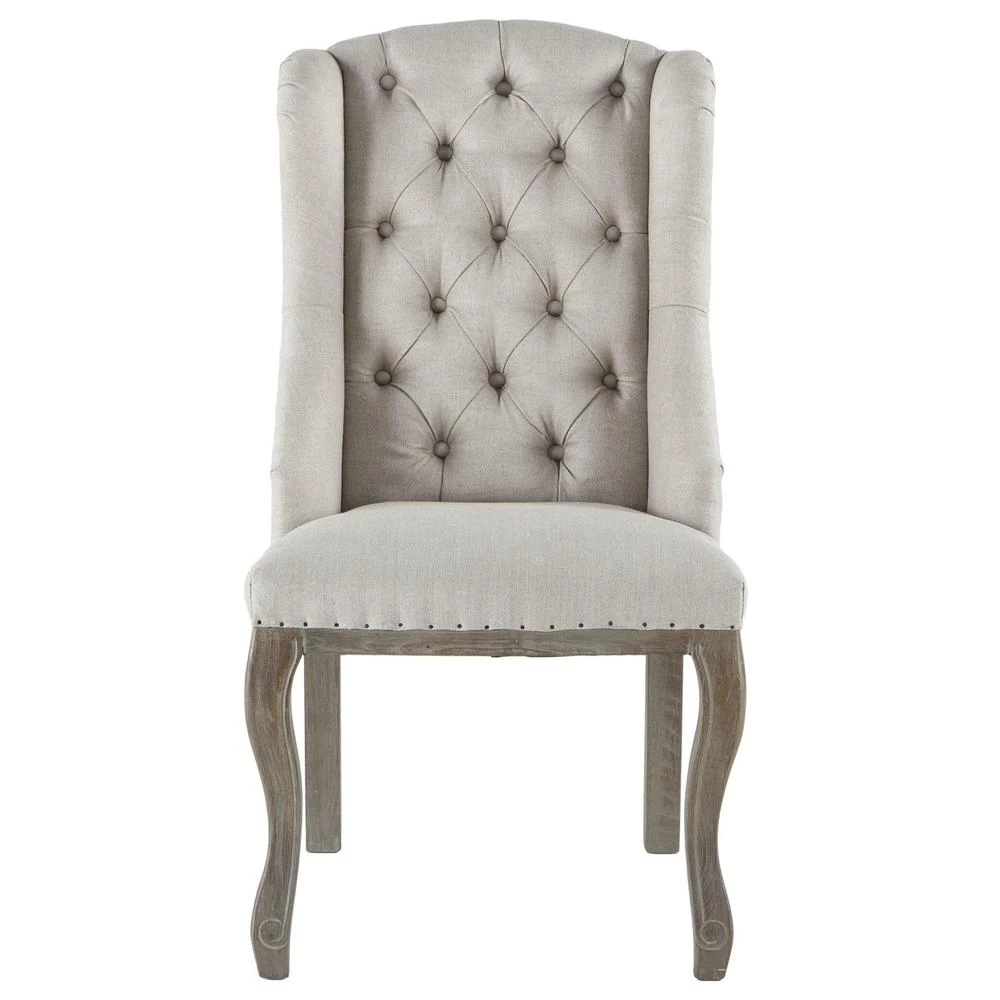 This chair boasts a real oak hardwood frame upholstered in a linen and jute blend fabric with tufted seat back and framed side panels. The off-white linen upholstery with the pickled oak finish of the wood frame and legs provides a distinguished touch to any classic, traditional decor style. This beautiful Portia high back dining chair includes diamond-shaped button detailing along the seat back. No assembly required.